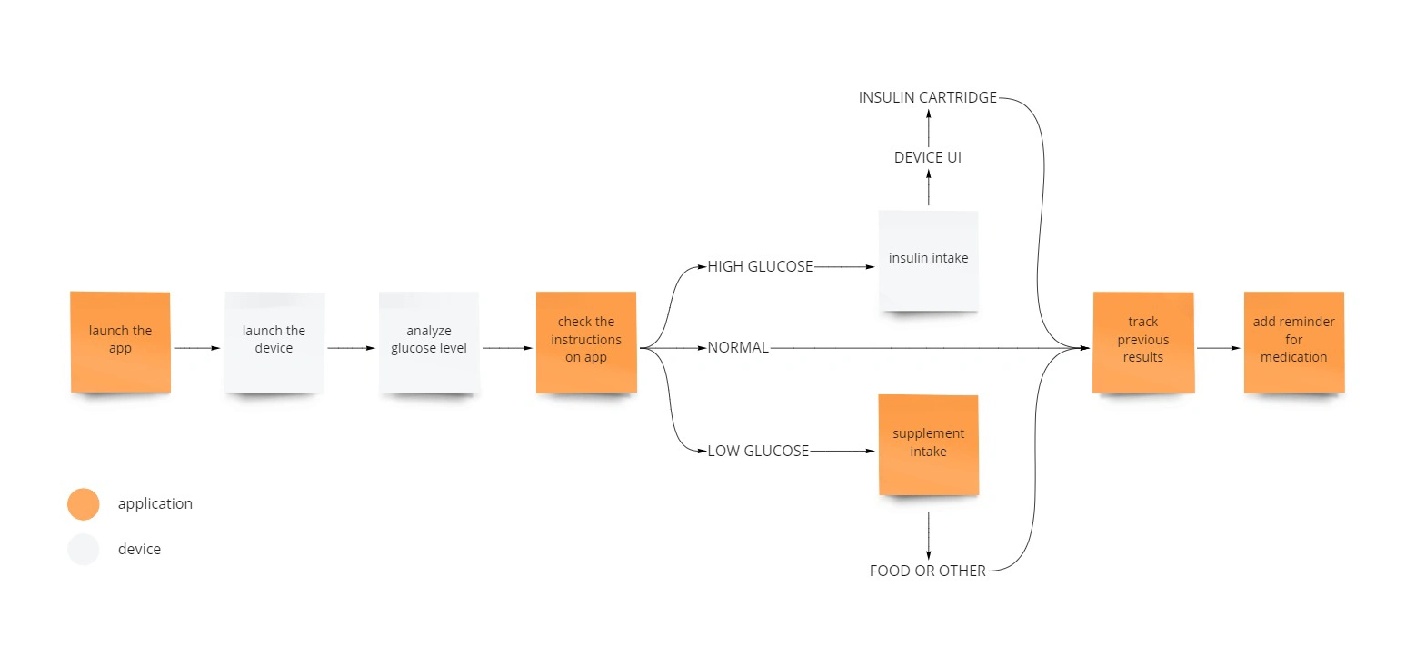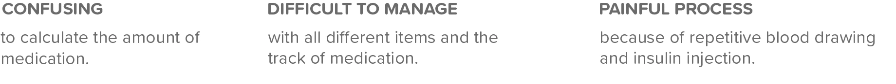 Diabetes is a difficult disease to manage. Patients have many challenges to handle on a daily basis; such as blood sugar monitoring, keep track of medication and insulin therapy. They need different devices for each process which makes the treatment even more stressful.To have a deeper understanding of daily management process of the disease, we carried out an ethnographic research with three diabetes patients. We observed and interviewed them in order to gather qualitative data. Our findings are presented as a journey map below.