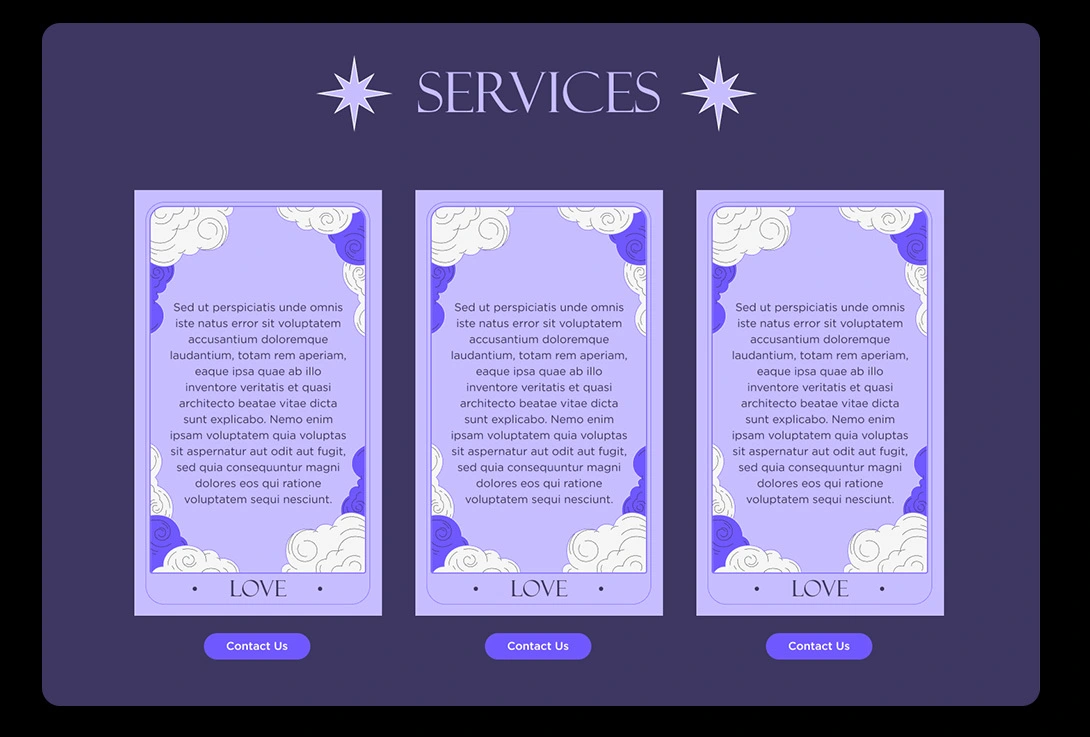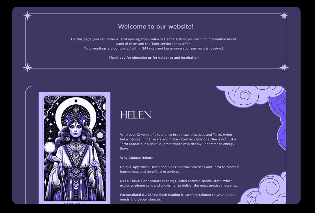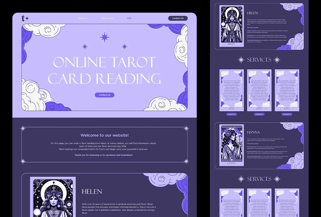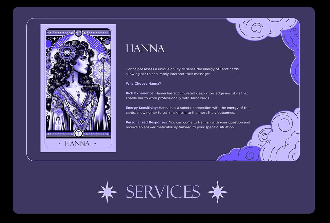 The design successfully combines mystical aesthetics with usability, allowing users to easily navigate the content and understand the services offered.