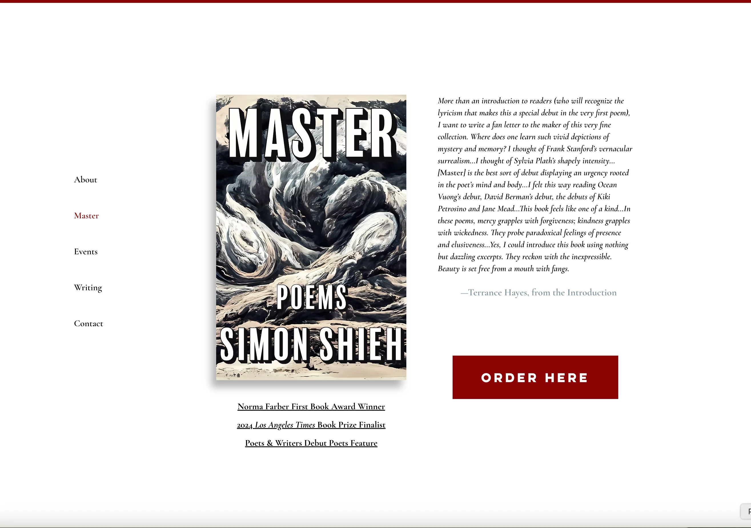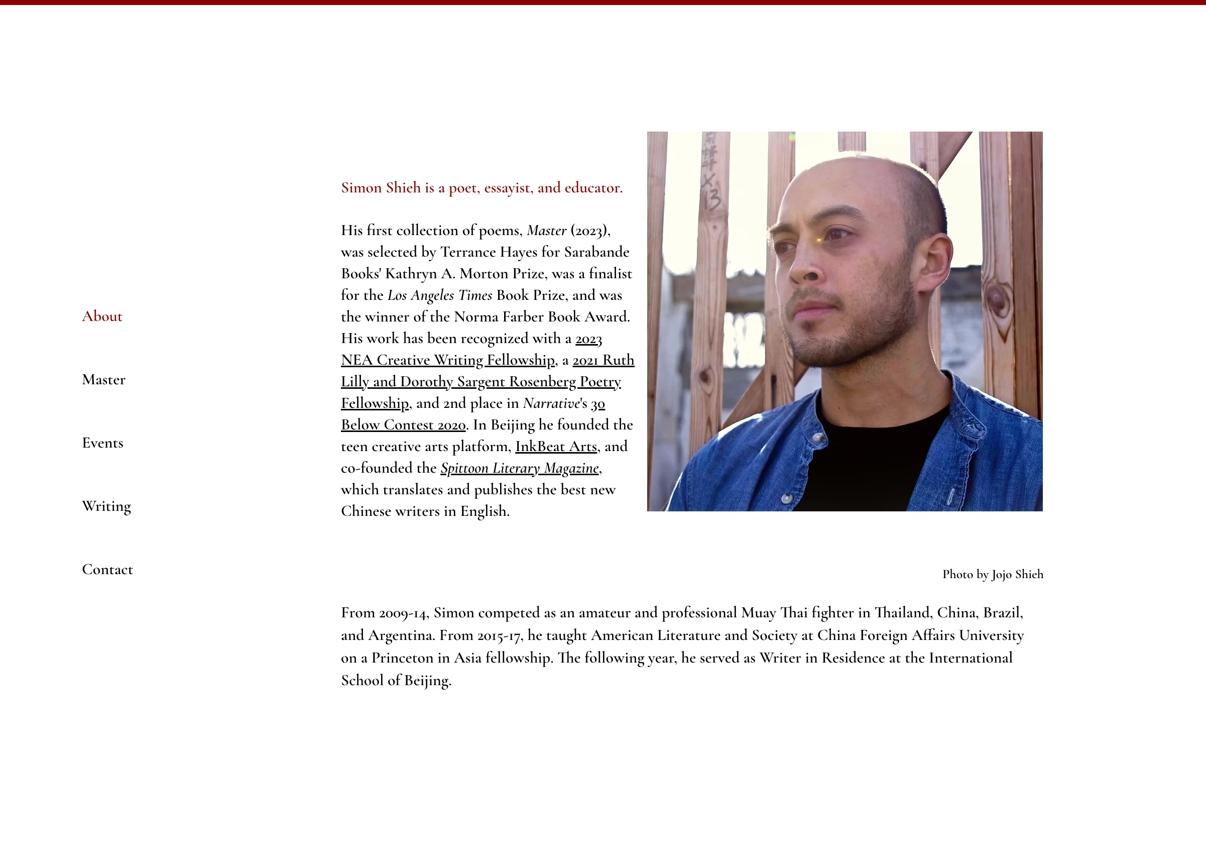 Simon Shieh is a poet, essayist, and educator. His first collection of poems, Master (2023), was selected by Terrance Hayes for Sarabande Books' Kathryn A. Morton Prize, was a finalist for the Los Angeles Times Book Prize, and was the winner of the Norma Farber Book Award.