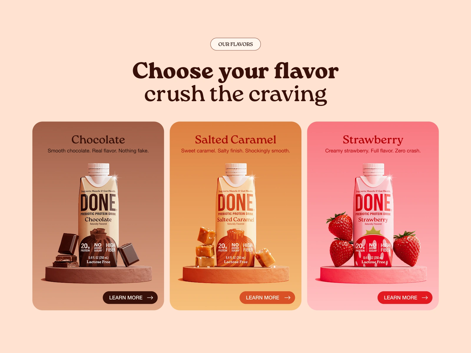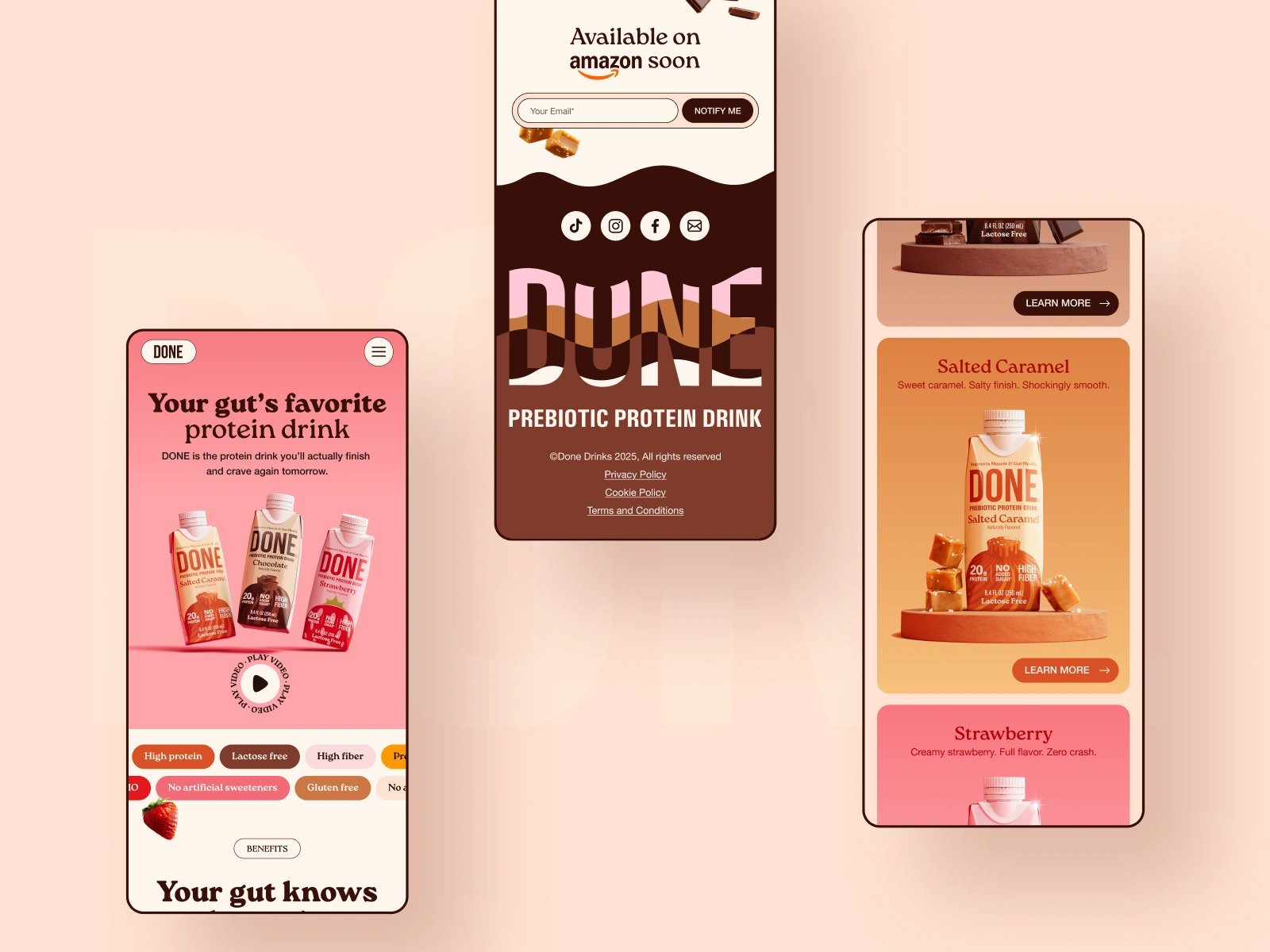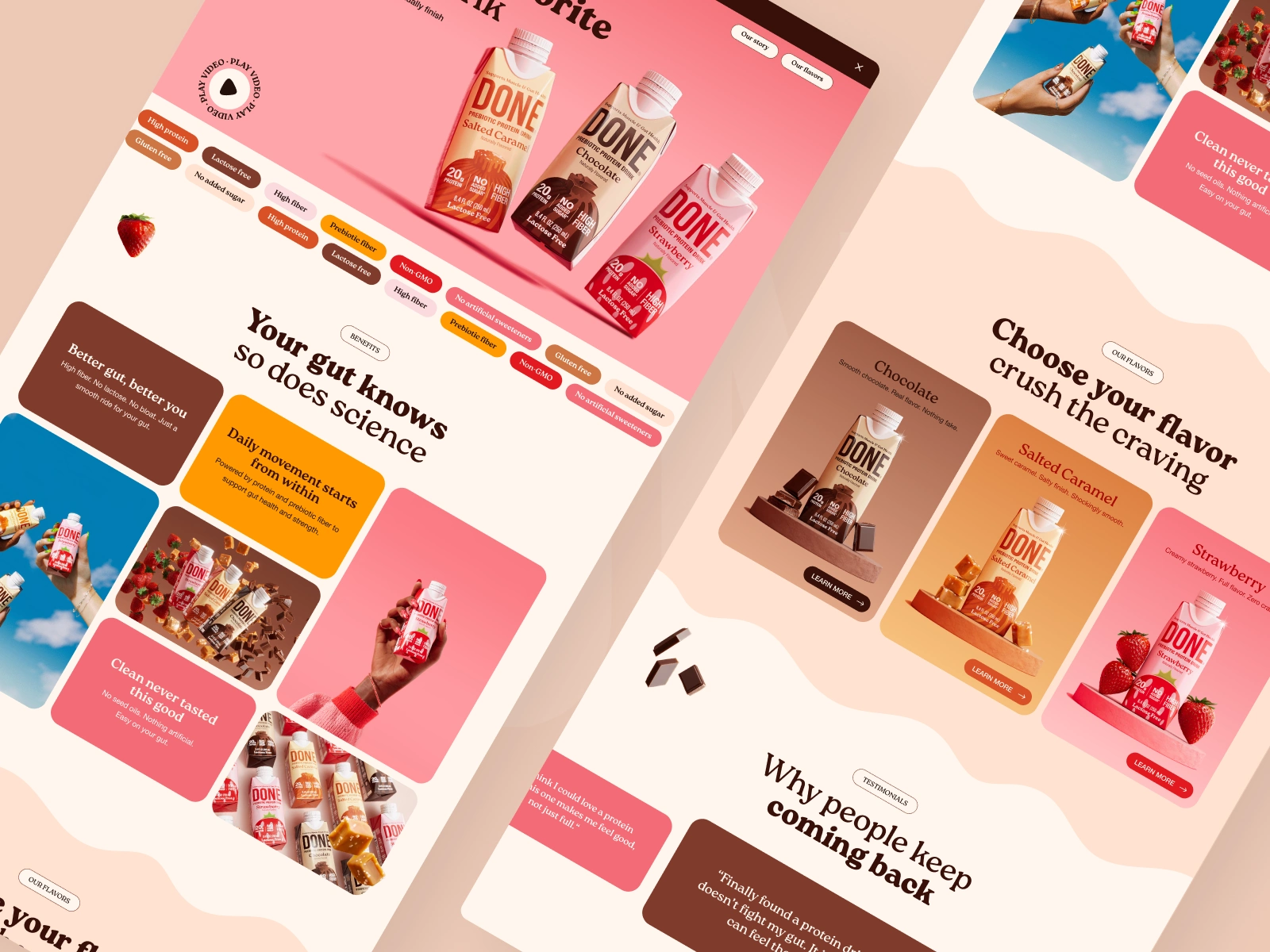 We built an experience that mirrors the confidence and clarity of the Done Drinks brand. Large scale visuals, playful motion, and a clear flavor navigation system keep users engaged from the first scroll to flavor selection. Every detail, from typography to layout, was crafted to make the brand’s personality shine and the product story easy to follow.