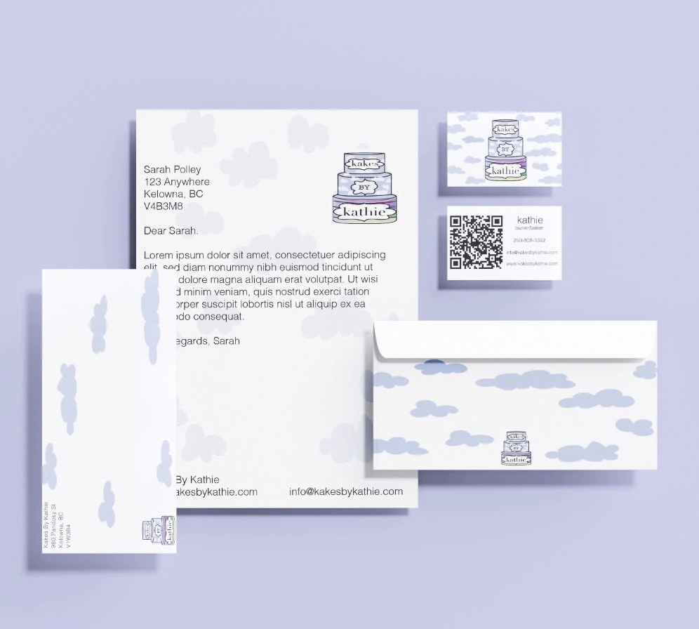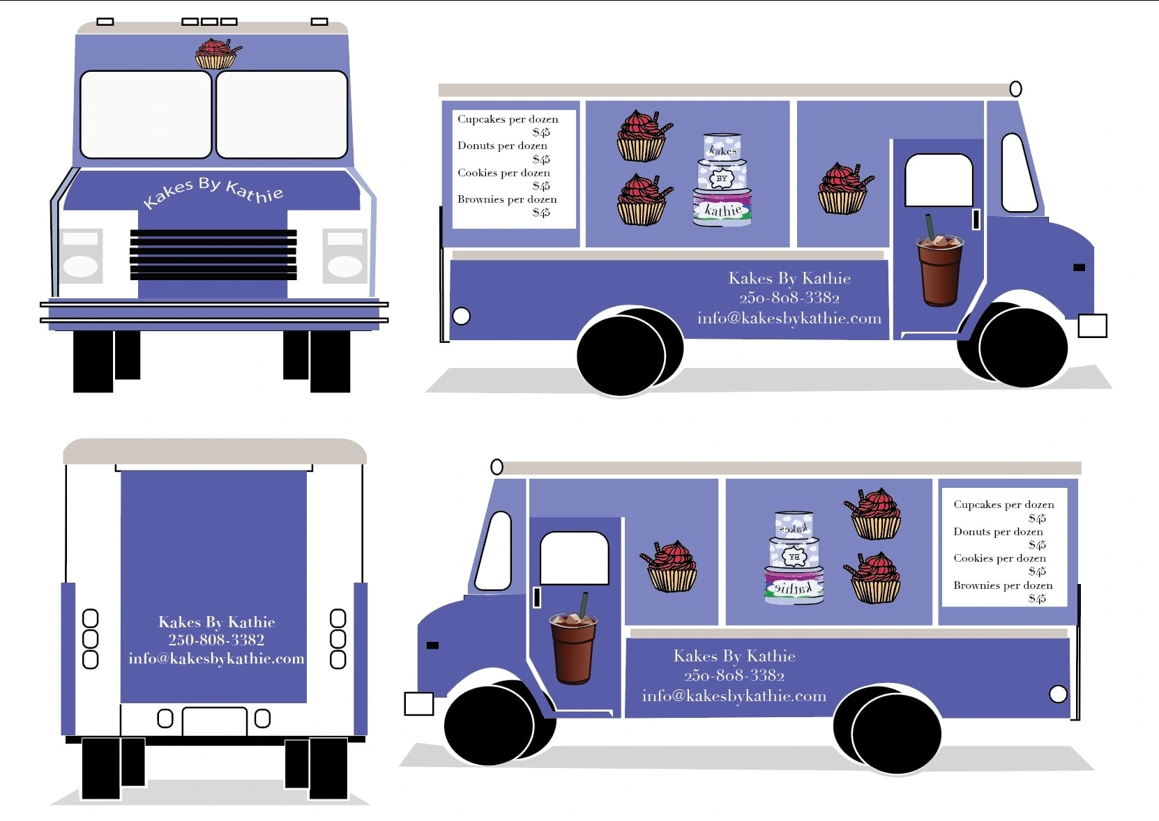 I created a brand identity, web landing page, web app icons, a food truck and stationary for Kathie who owns the bakery.