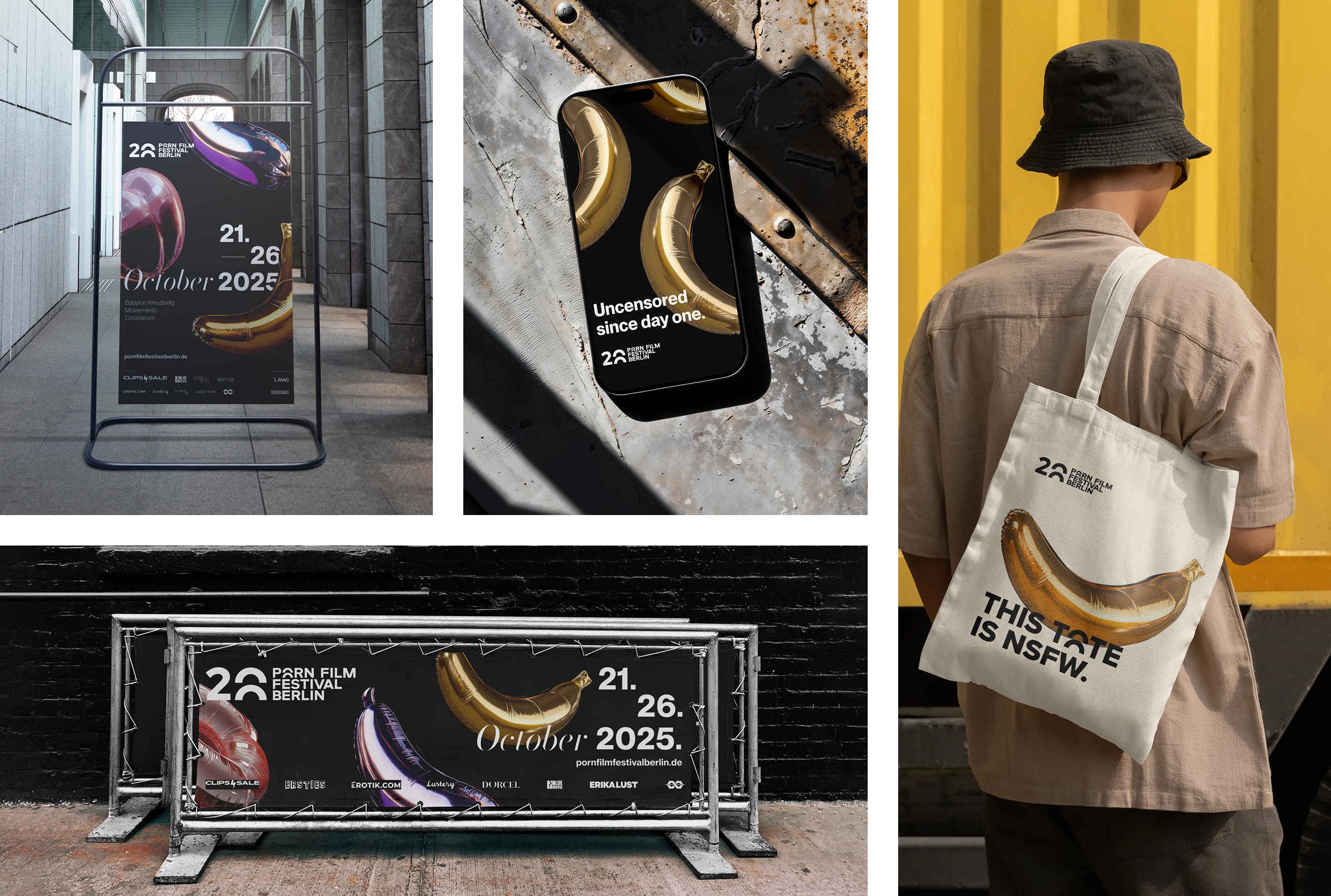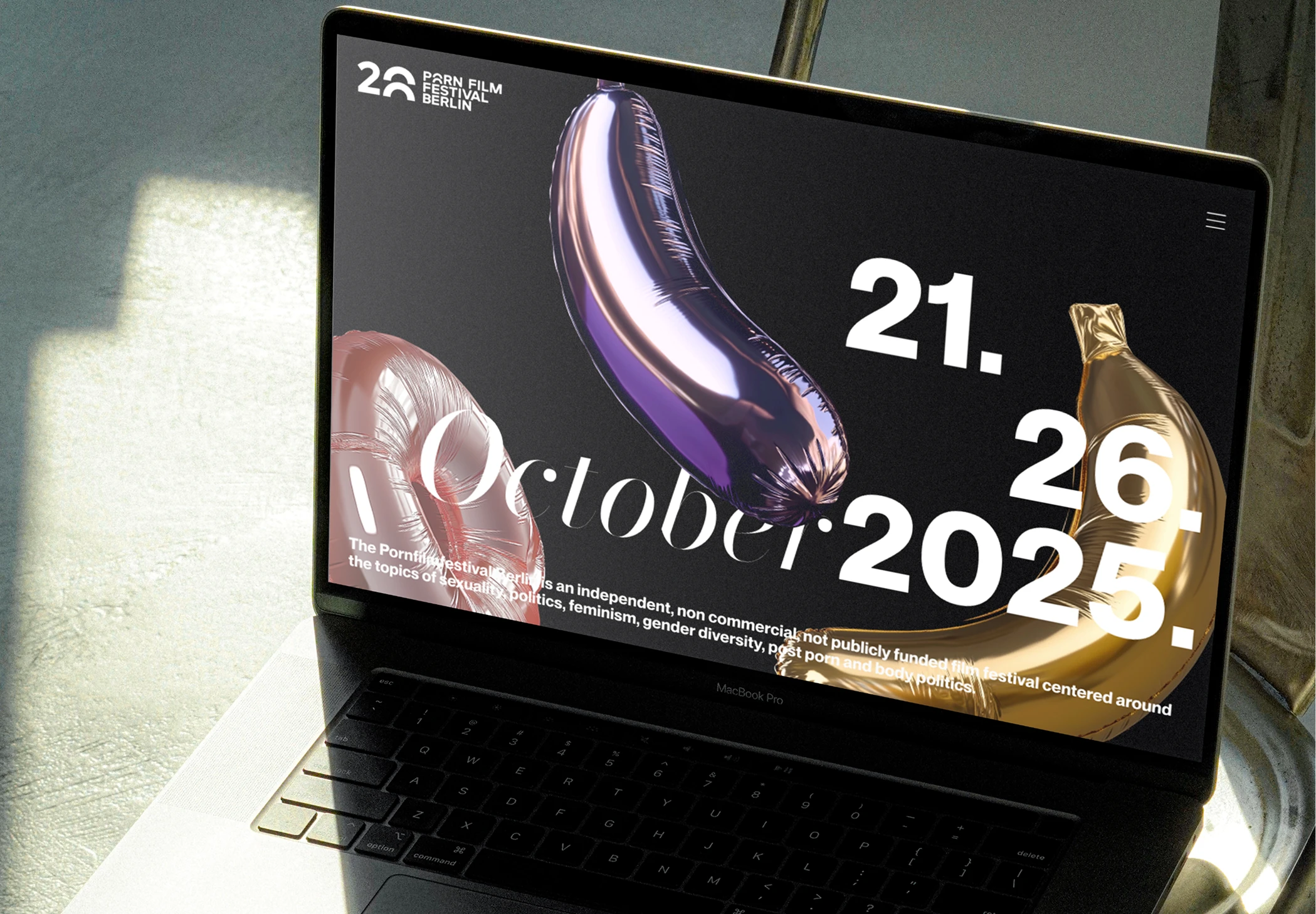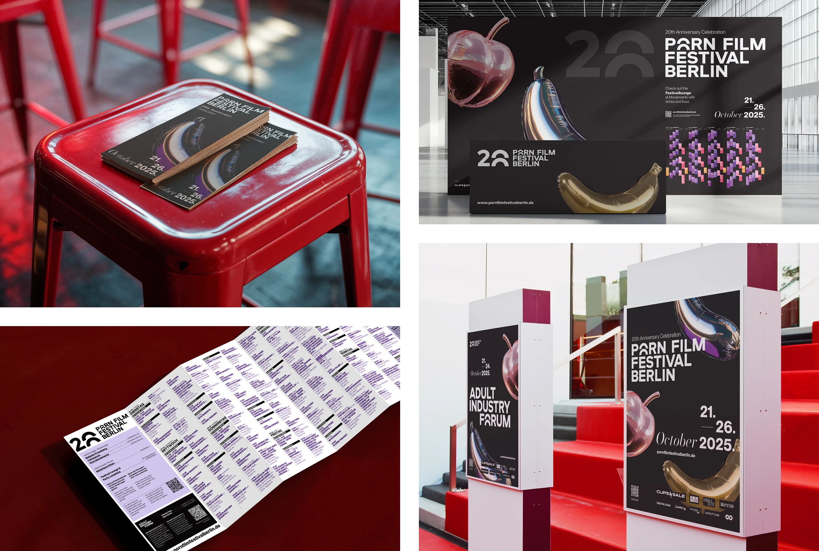 PFFB celebrates queer culture, underground cinema, and body positivity. To reflect that energy, for its 20th anniversary, rebranding was conceptualised to capture both the rebellious spirit of the oldest porn festival in Europe and the sophistication of its legacy by exploring imagery outside the standard box of stigmatic expectations tied to the adult industry. Glossy bananas, eggplants, cherries, rings: they carry just enough suggestion, but are Playful, surreal, and sculptural, inviting curiosity rather than cliché.