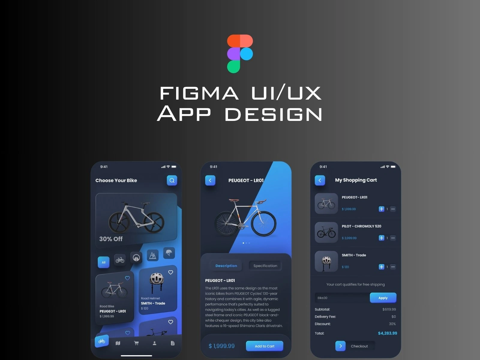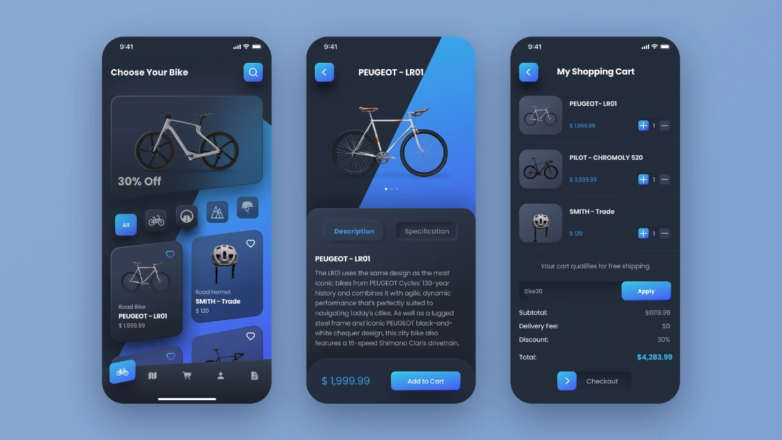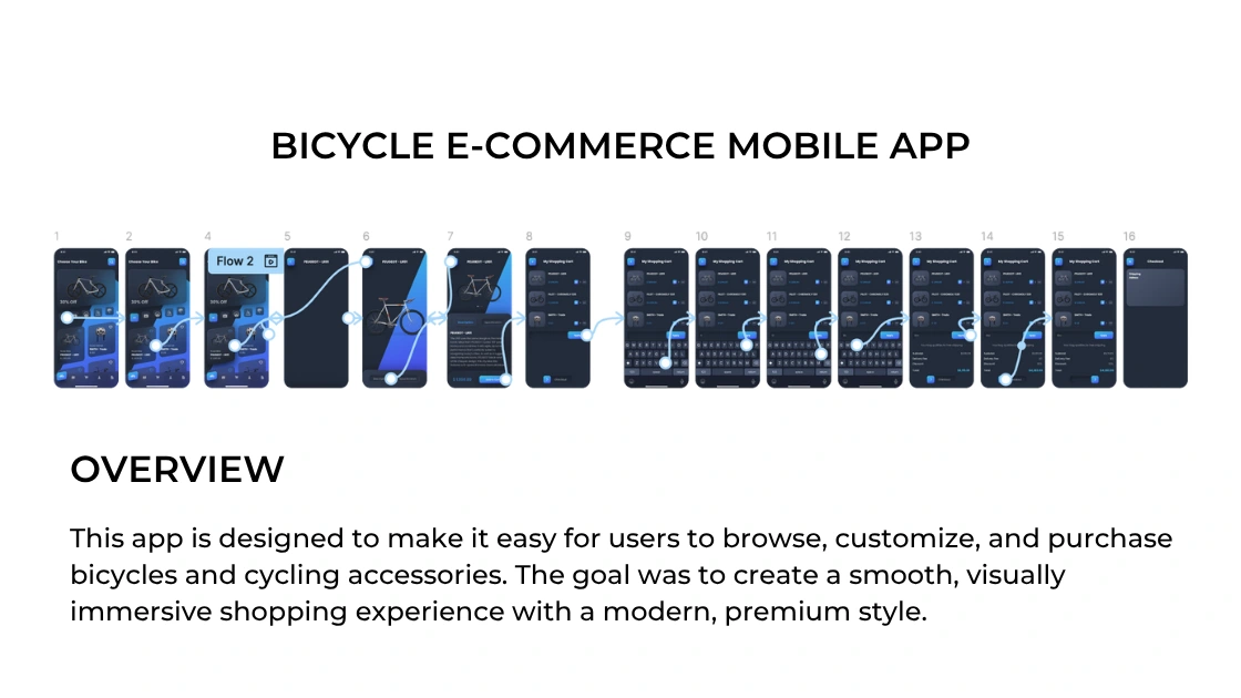 A sleek mobile e-commerce app for bicycles, designed with smooth navigation, bold product visuals, and a clean, immersive user experience.