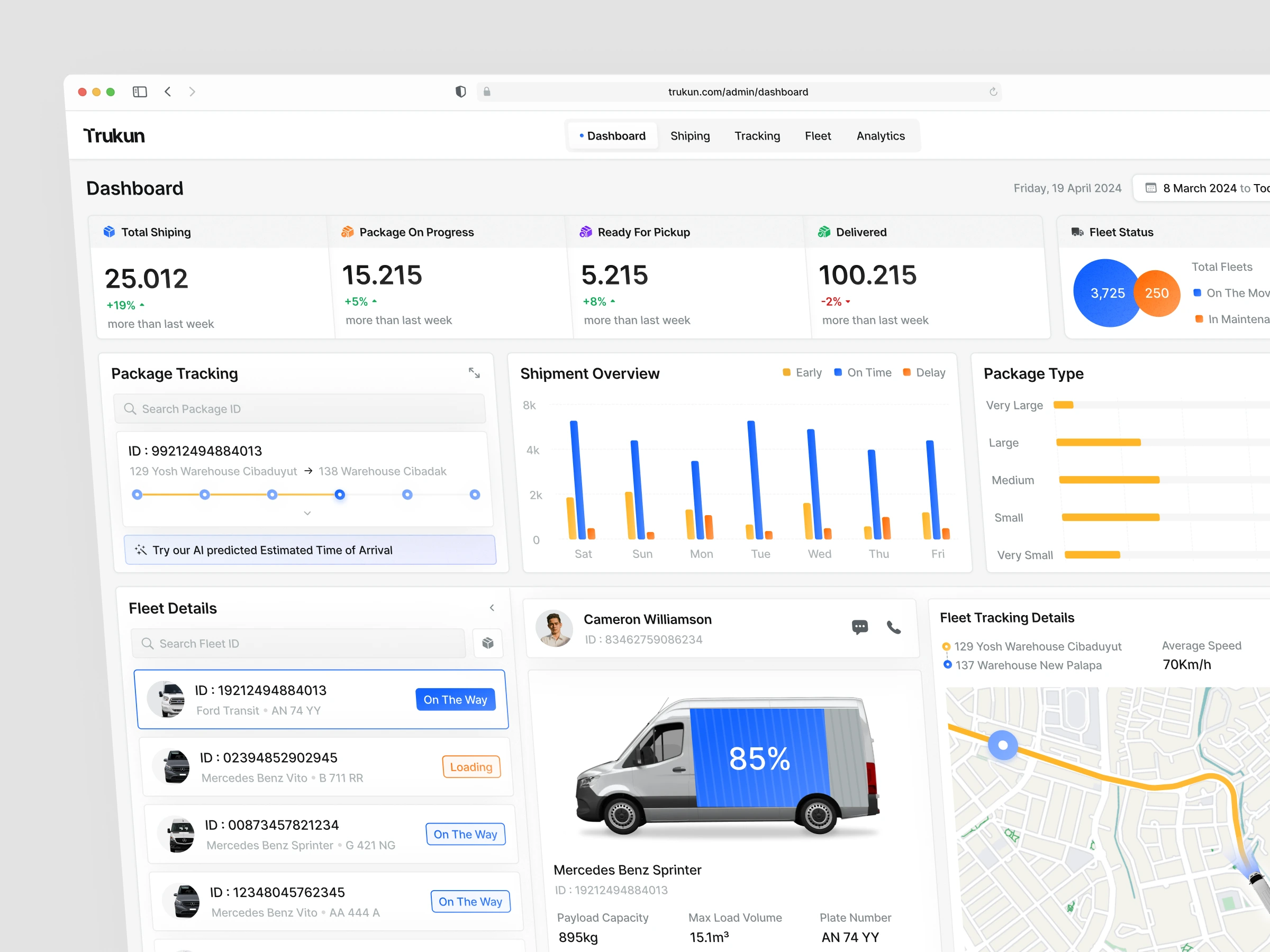 The main dashboard for Trukun Shipment. It provides logistics managers with a comprehensive, at-a-glance view of all active shipments and fleet status.