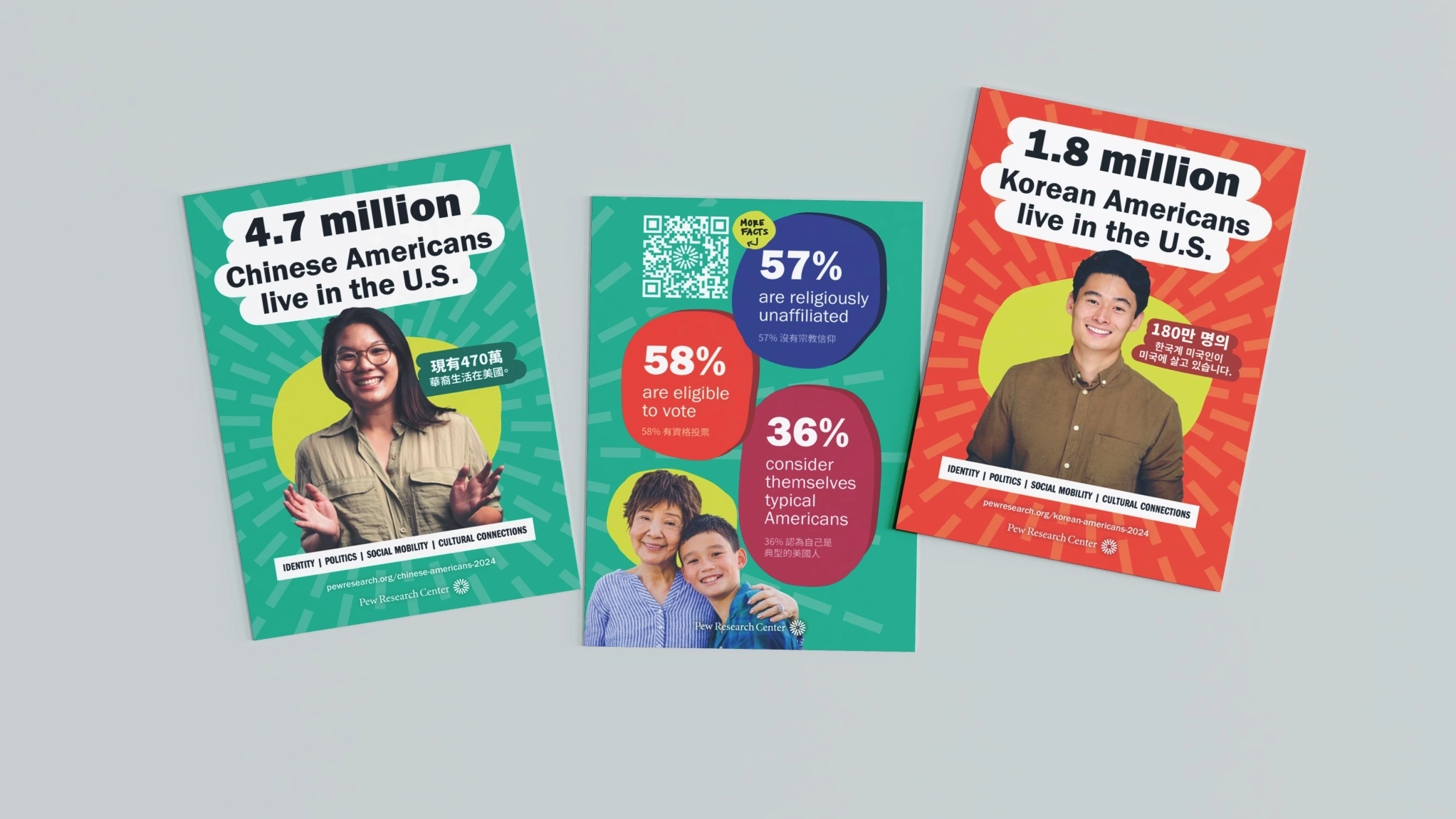 This campaign ran in NYC and LA in fall 2024, and highlighted Pew Research Center’s Asian American research portfolio. I worked closely with research and communications colleagues, as well external vendors, on the photography, design and messaging of these posters.