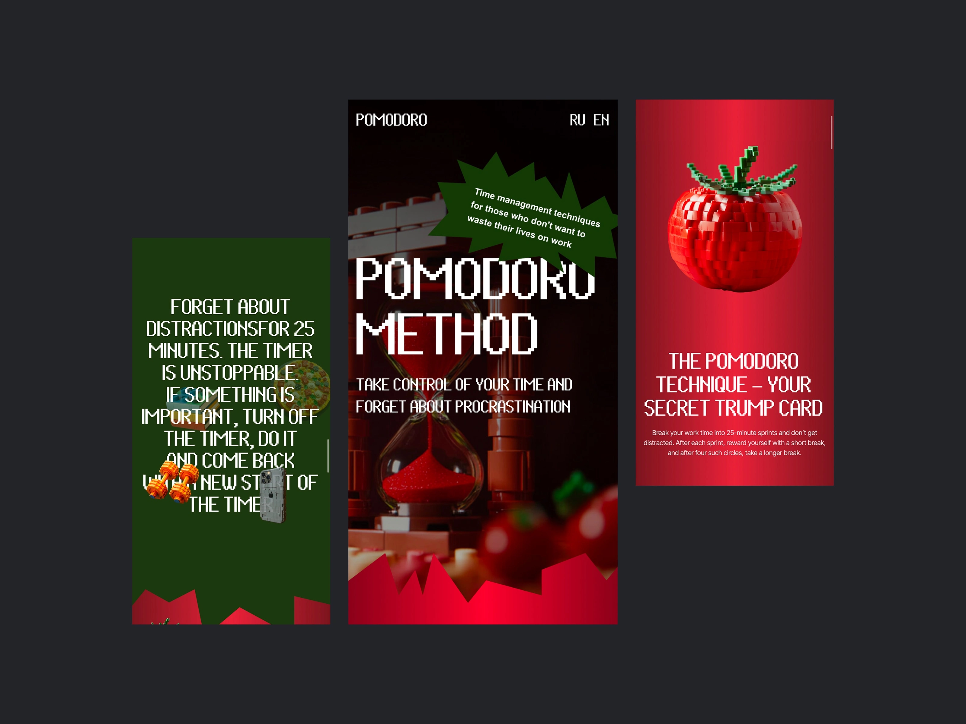 This project is a creative web-app concept for the Pomodoro Technique, designed to be engaging, not tedious. The design vision, inspired by LEGO aesthetics, treats tasks as "building blocks" (25-minute intervals), making time management visually simple and enjoyable.