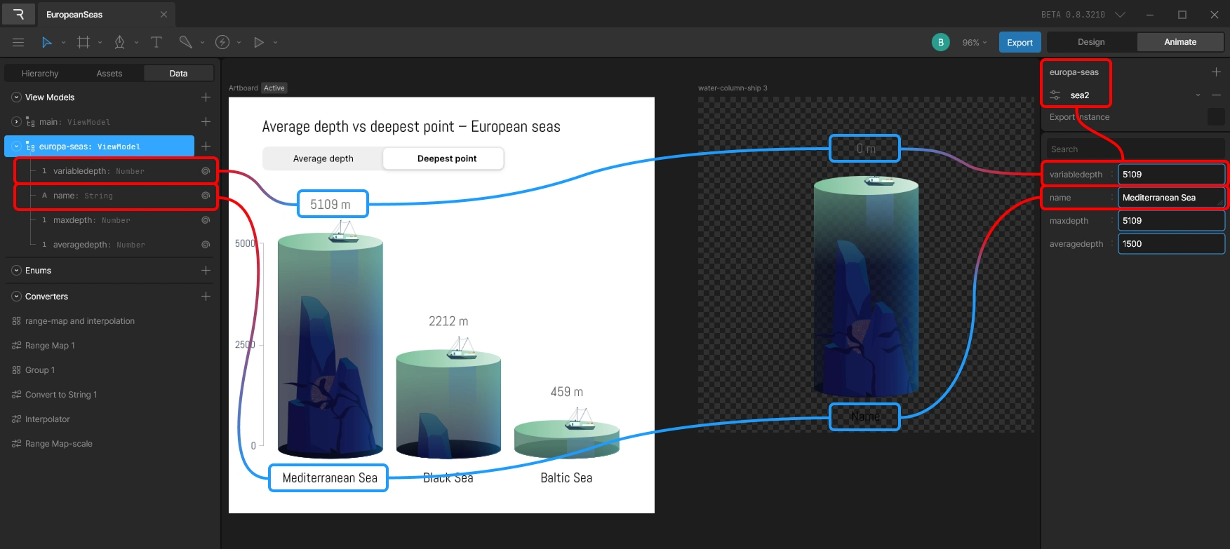 To accommodate multiple seas with varying depth properties, I utilized data binding and nested art boards. This allowed a single animated design to dynamically adapt based on specific data inputs. The structure was designed to be scalable, enabling easy addition of new water columns with unique characteristics without altering the core animation logic.