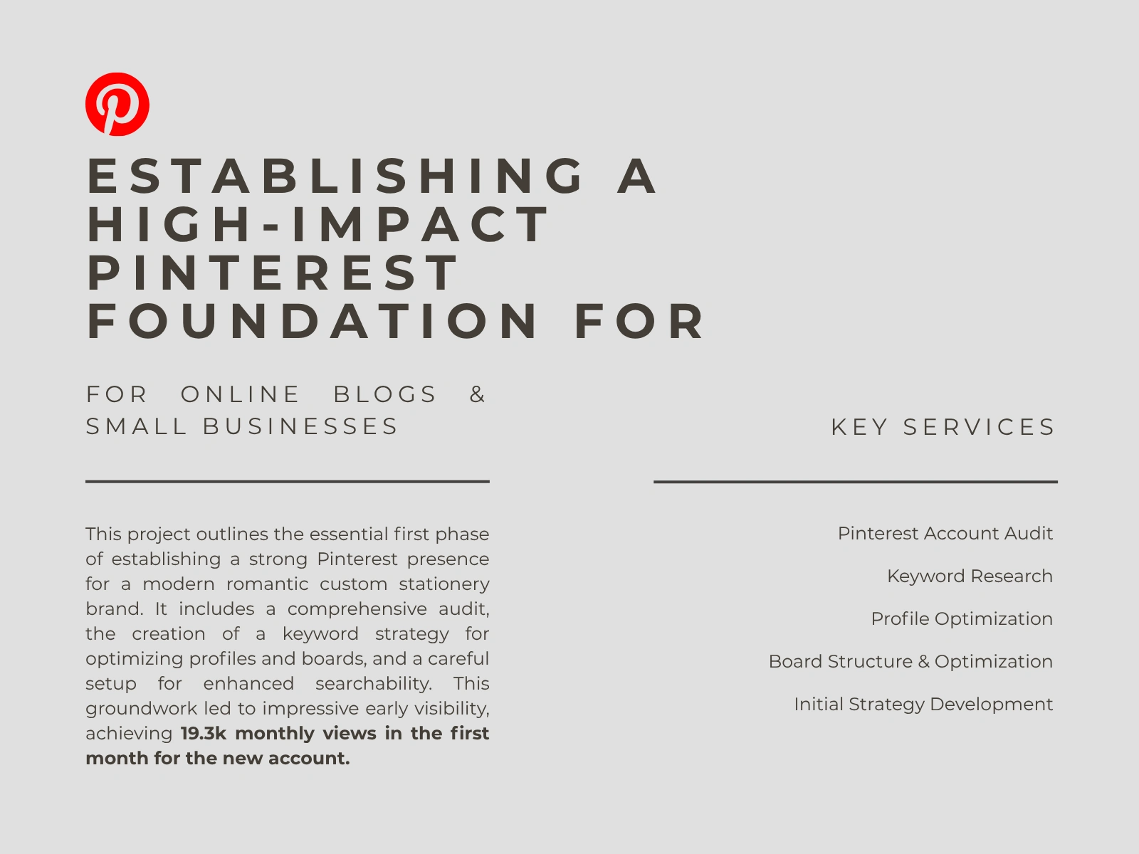 I built a Pinterest foundation for a stationery brand through a comprehensive audit and keyword strategy, achieving 19k monthly views in the first month.
