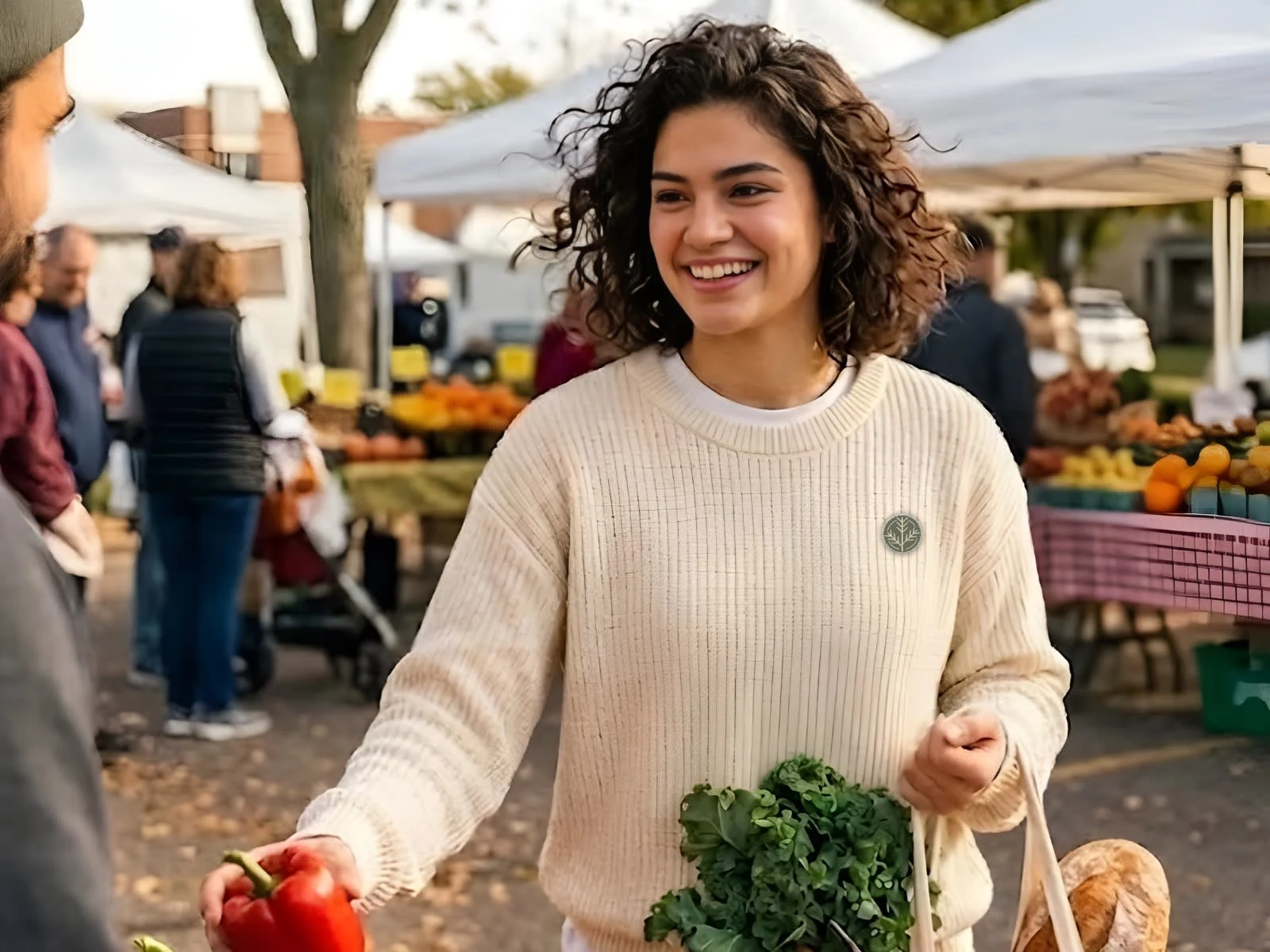 Human-centric lifestyle photography connecting sustainable fashion with community values. The candid setting at a local market highlights the brand's relatability and commitment to organic quality. #CommunityBranding #SustainableLifestyle #MindfulLiving #LifestyleFashion #AuthenticBrand #ModernLiving #ConsciousConsumer #KnitwearStyle #BrandValues #FashionPhotography