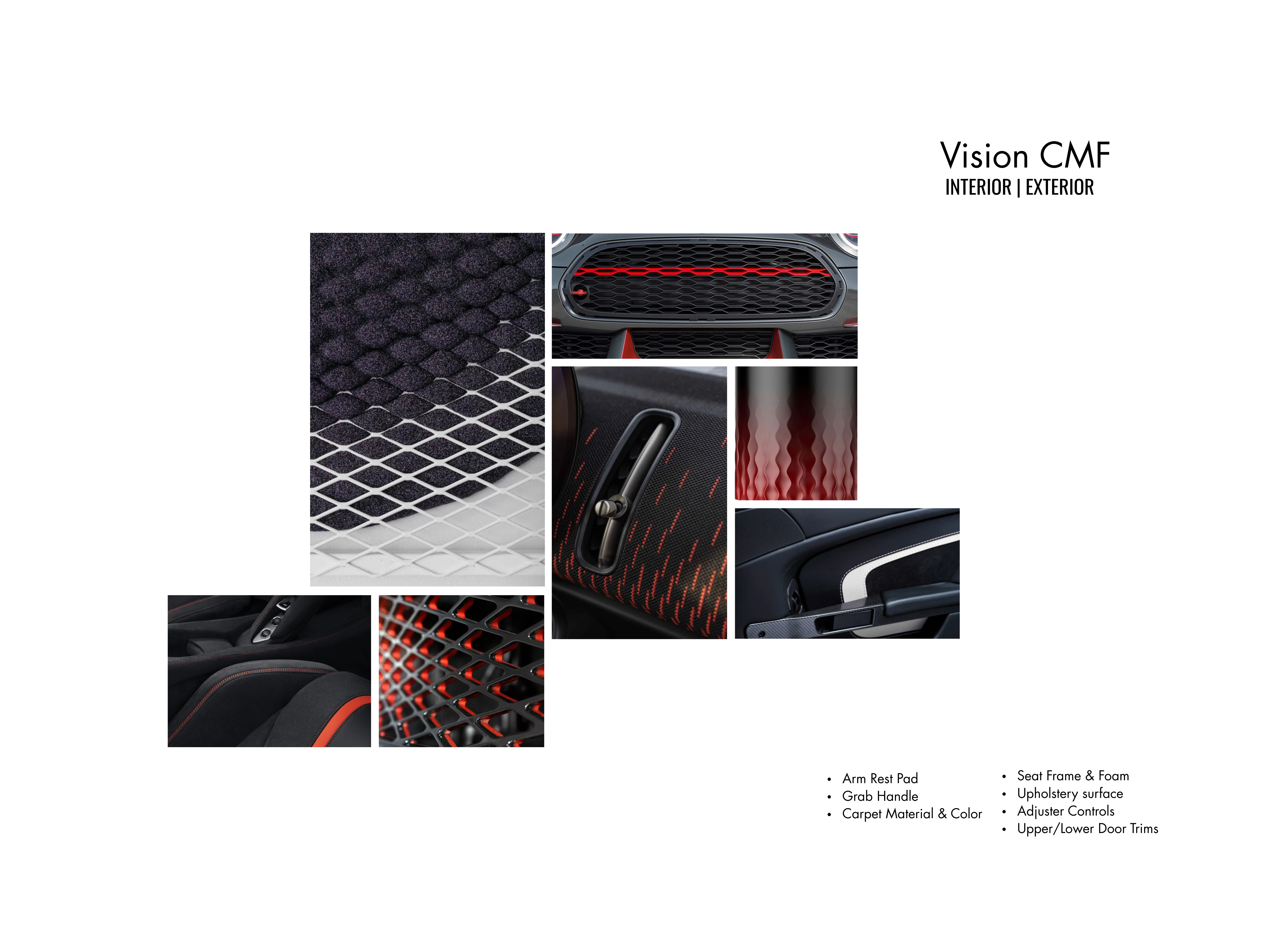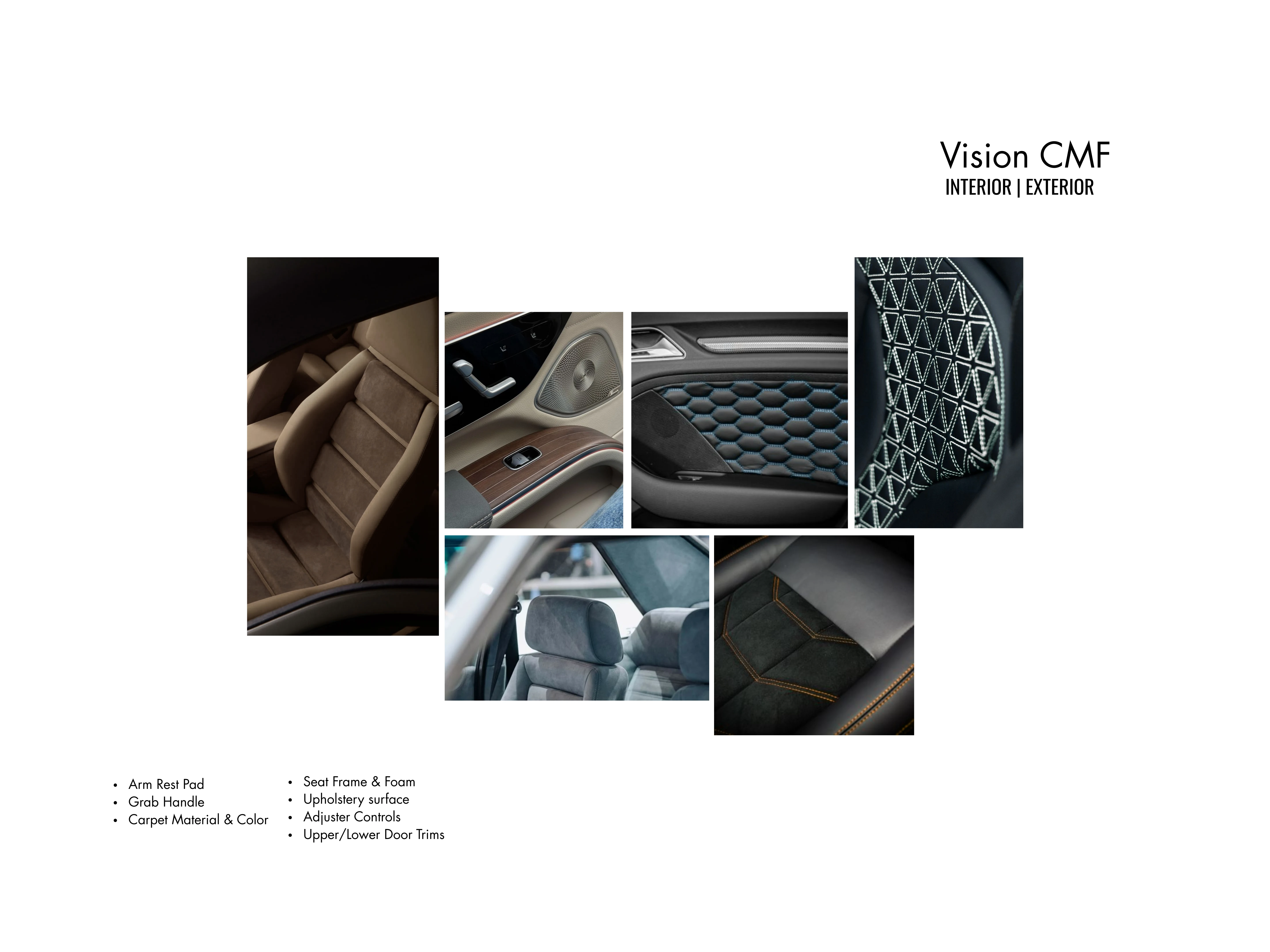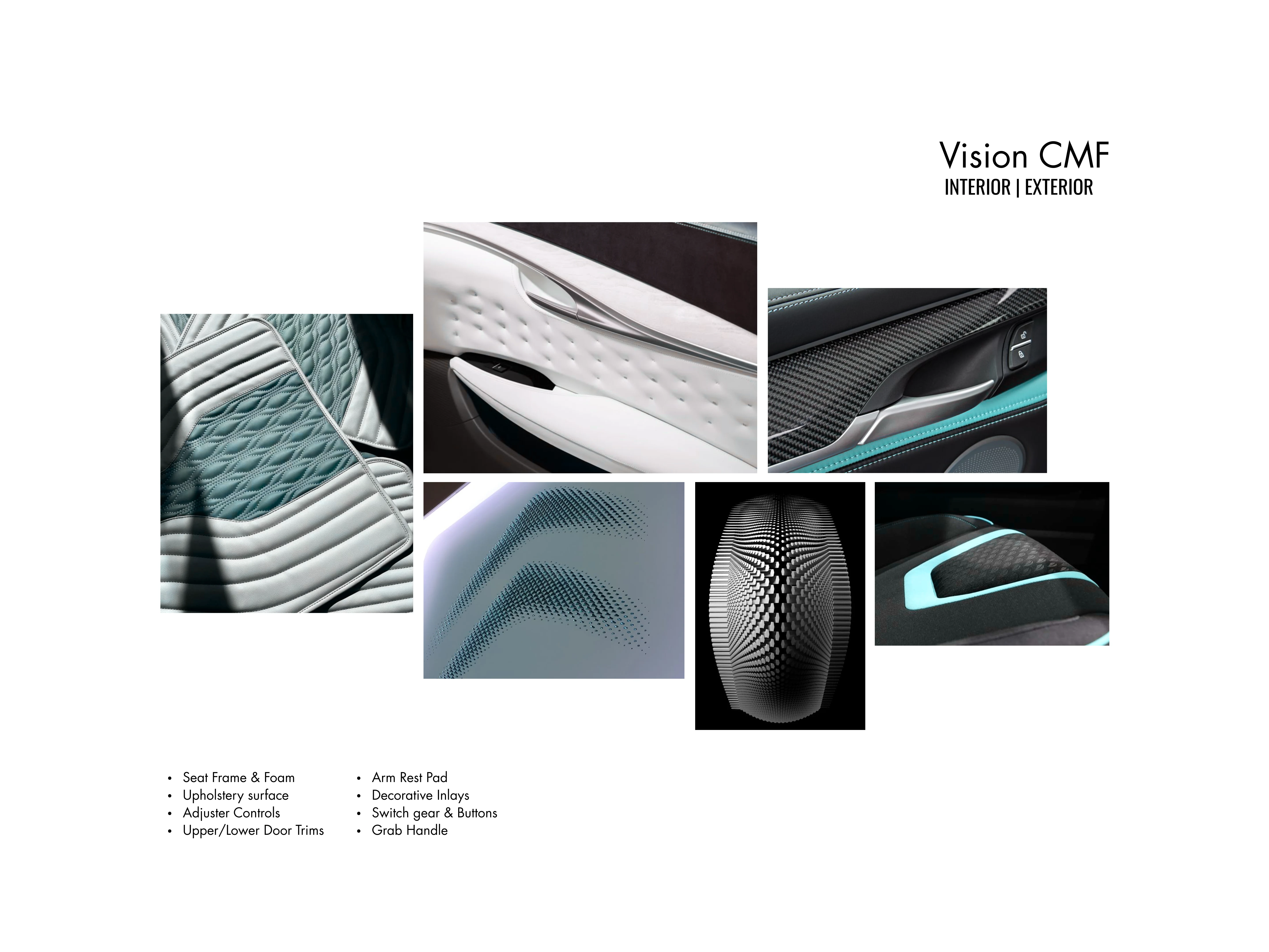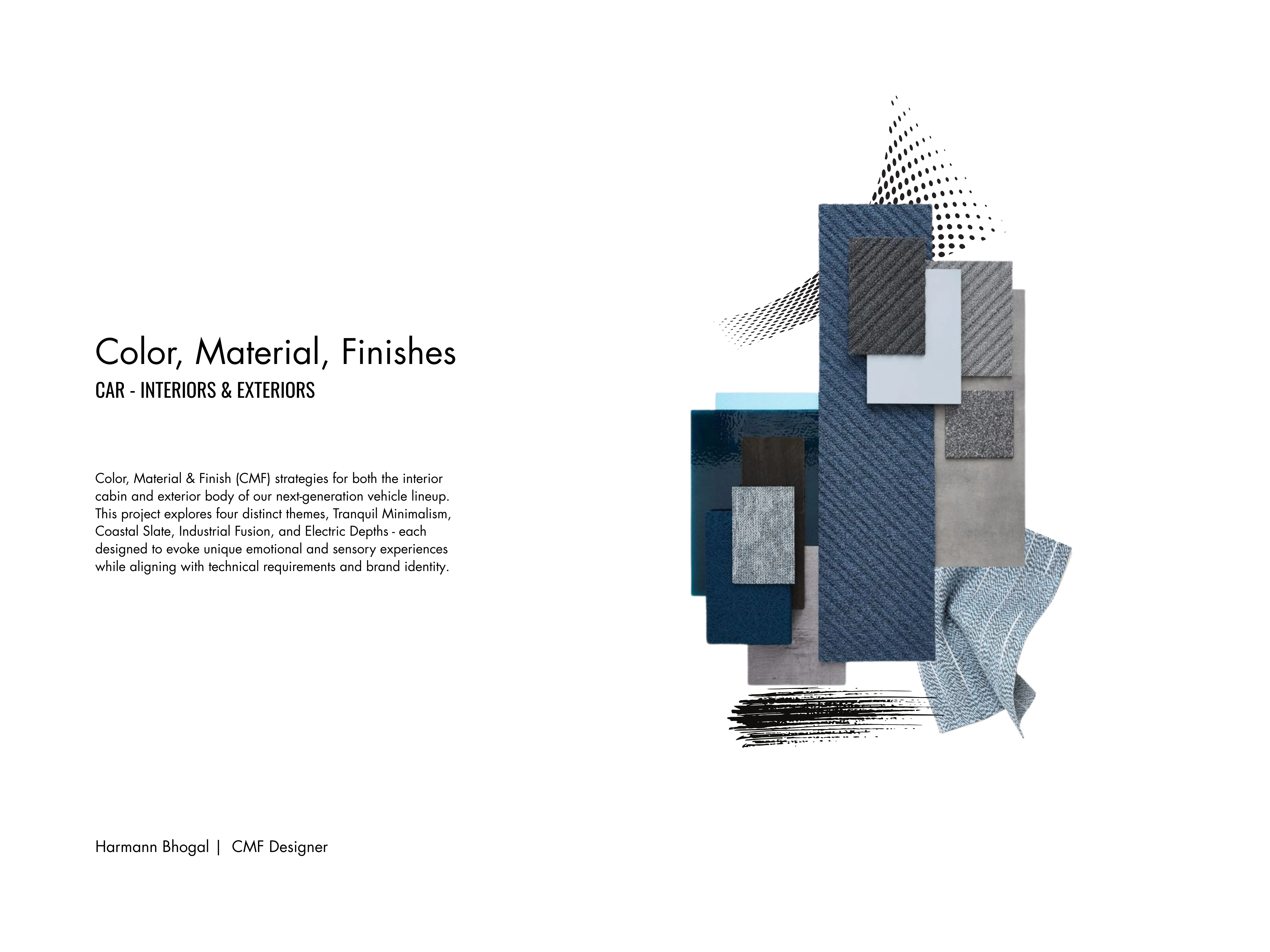 Color, Material & Finish (CMF) strategies for both the interior cabin and exterior body of our next-generation vehicle lineup. This project explores four distinct themes, Tranquil Minimalism, Coastal Slate, Industrial Fusion, and Electric Depths - each designed to evoke unique emotional and sensory experiences while aligning with technical requirements and brand identity.