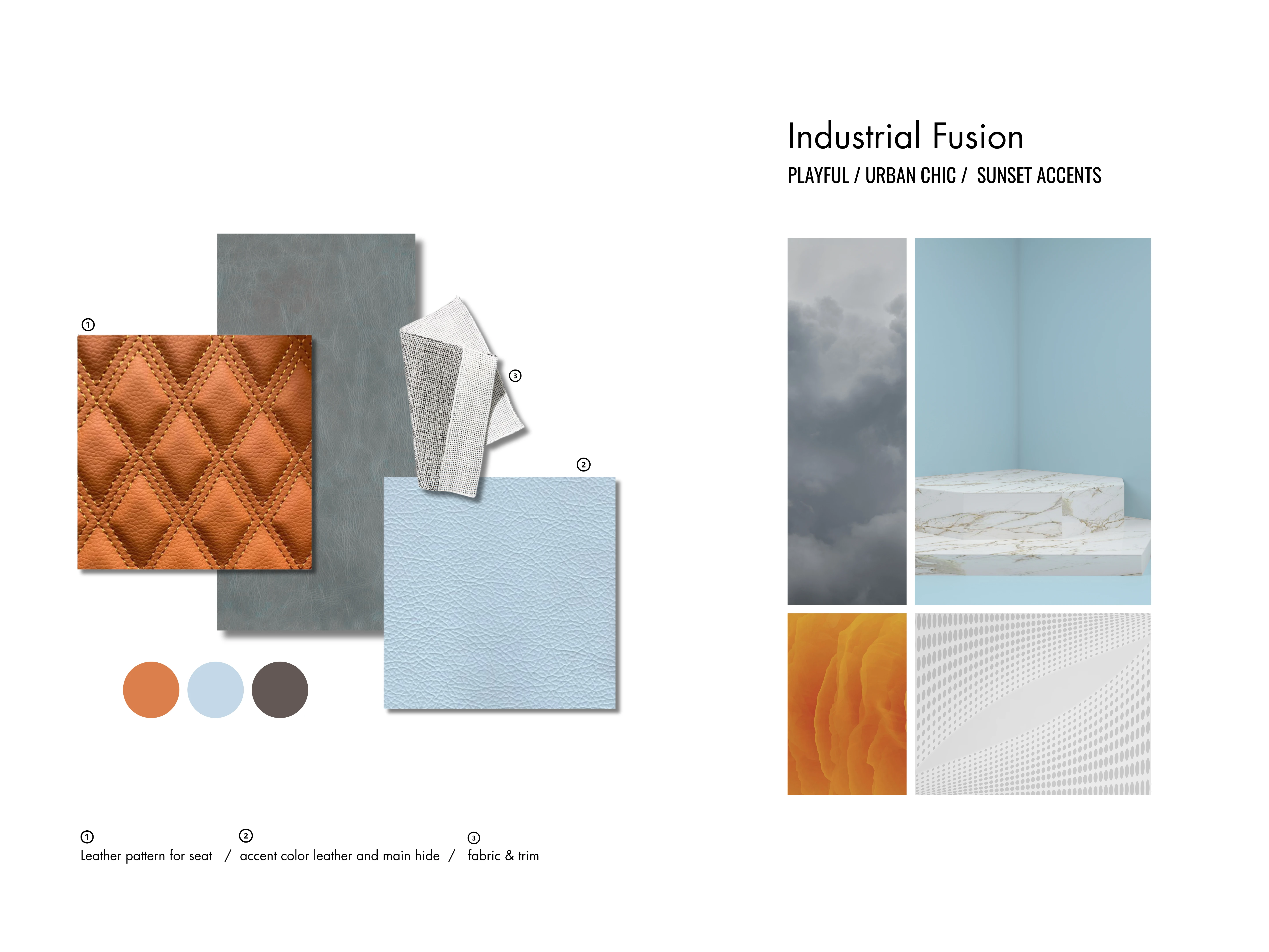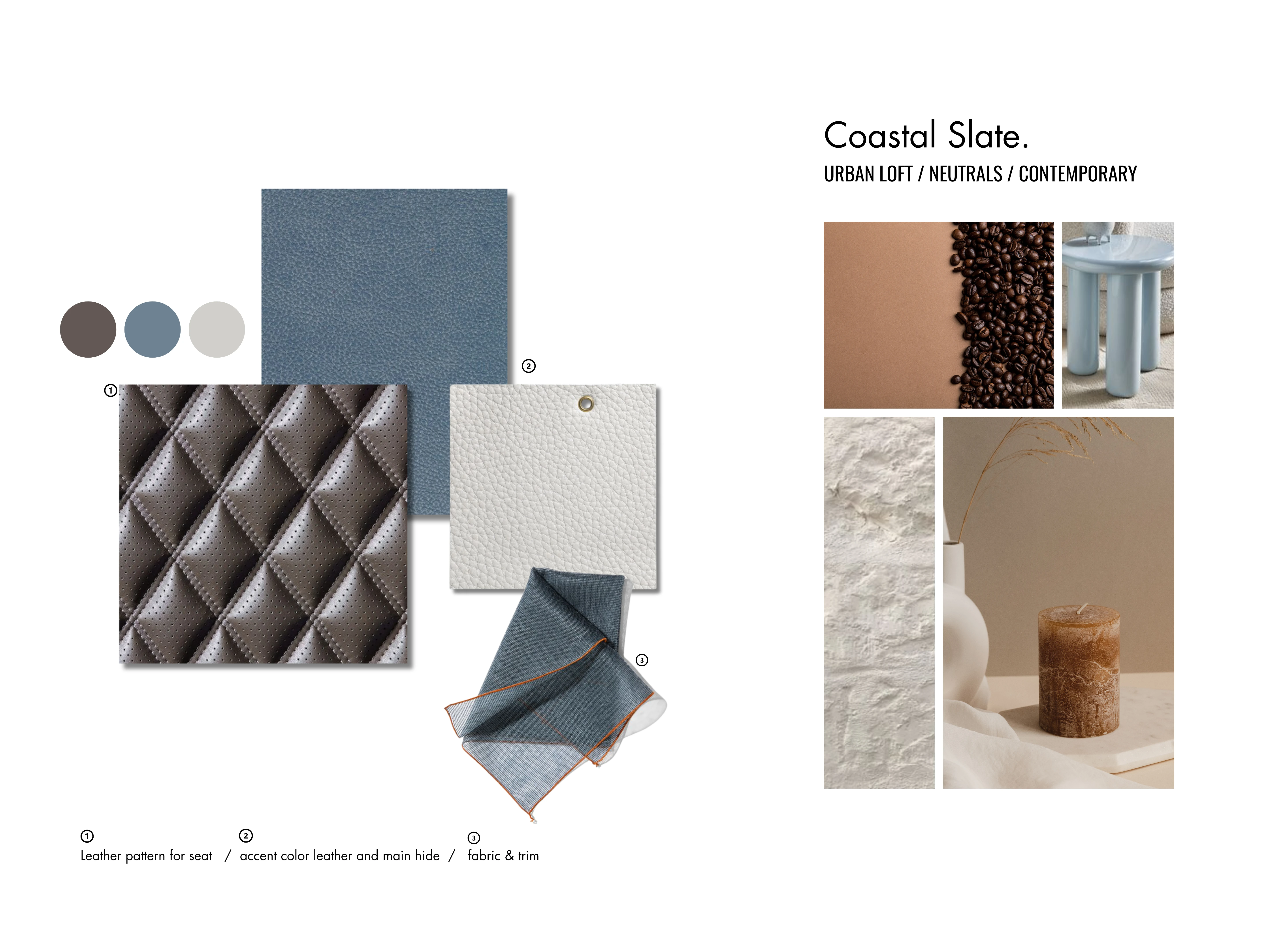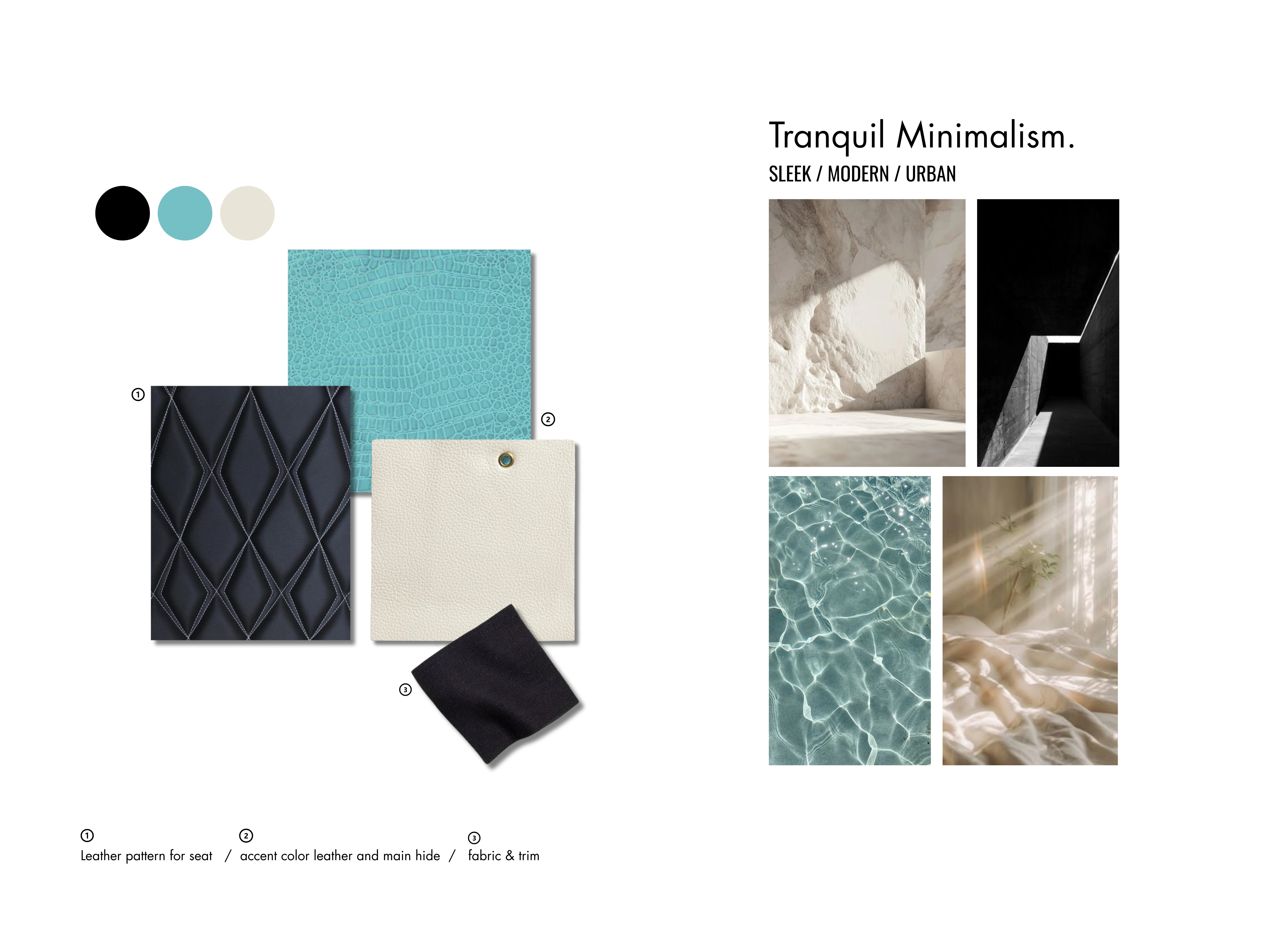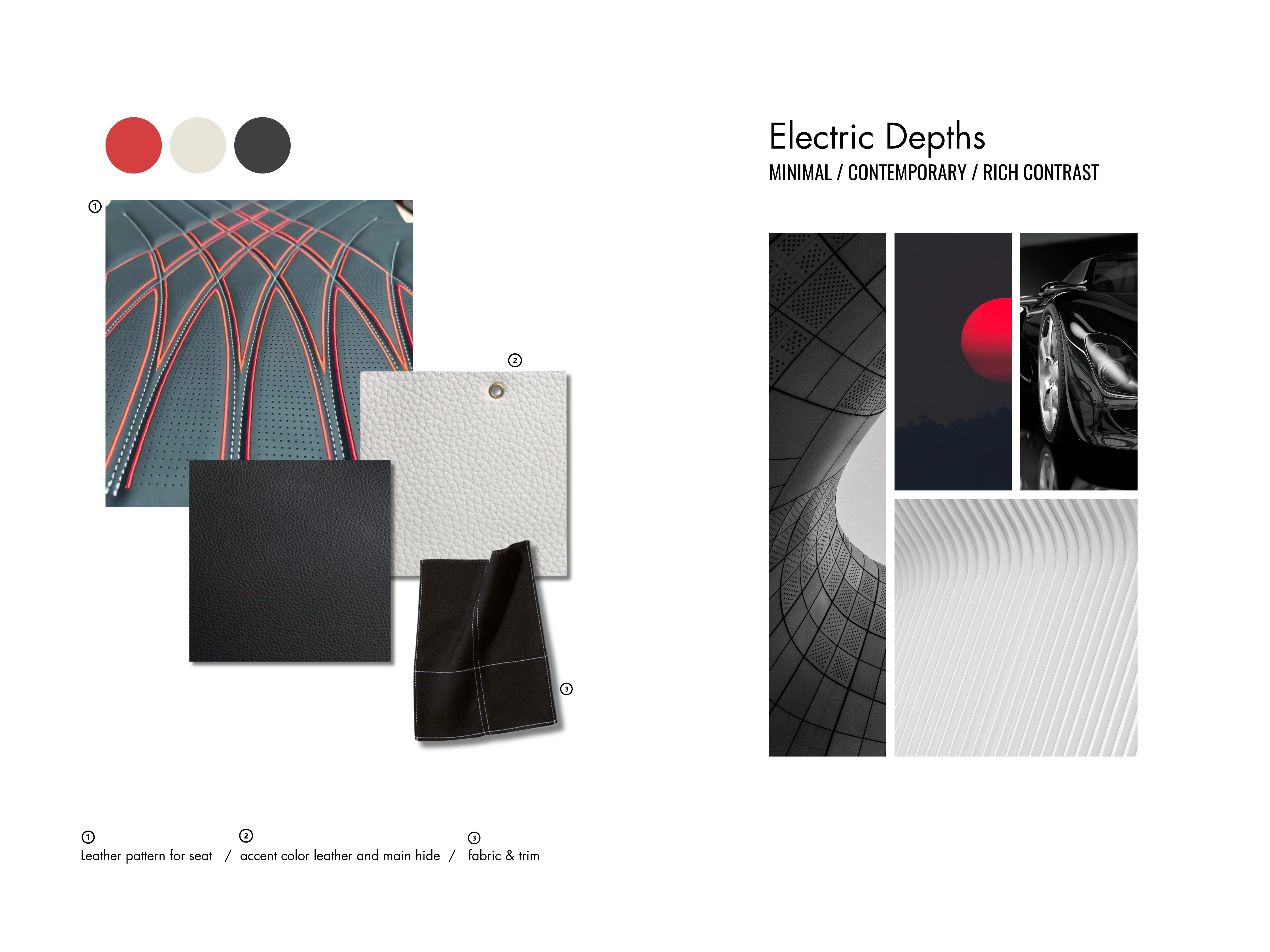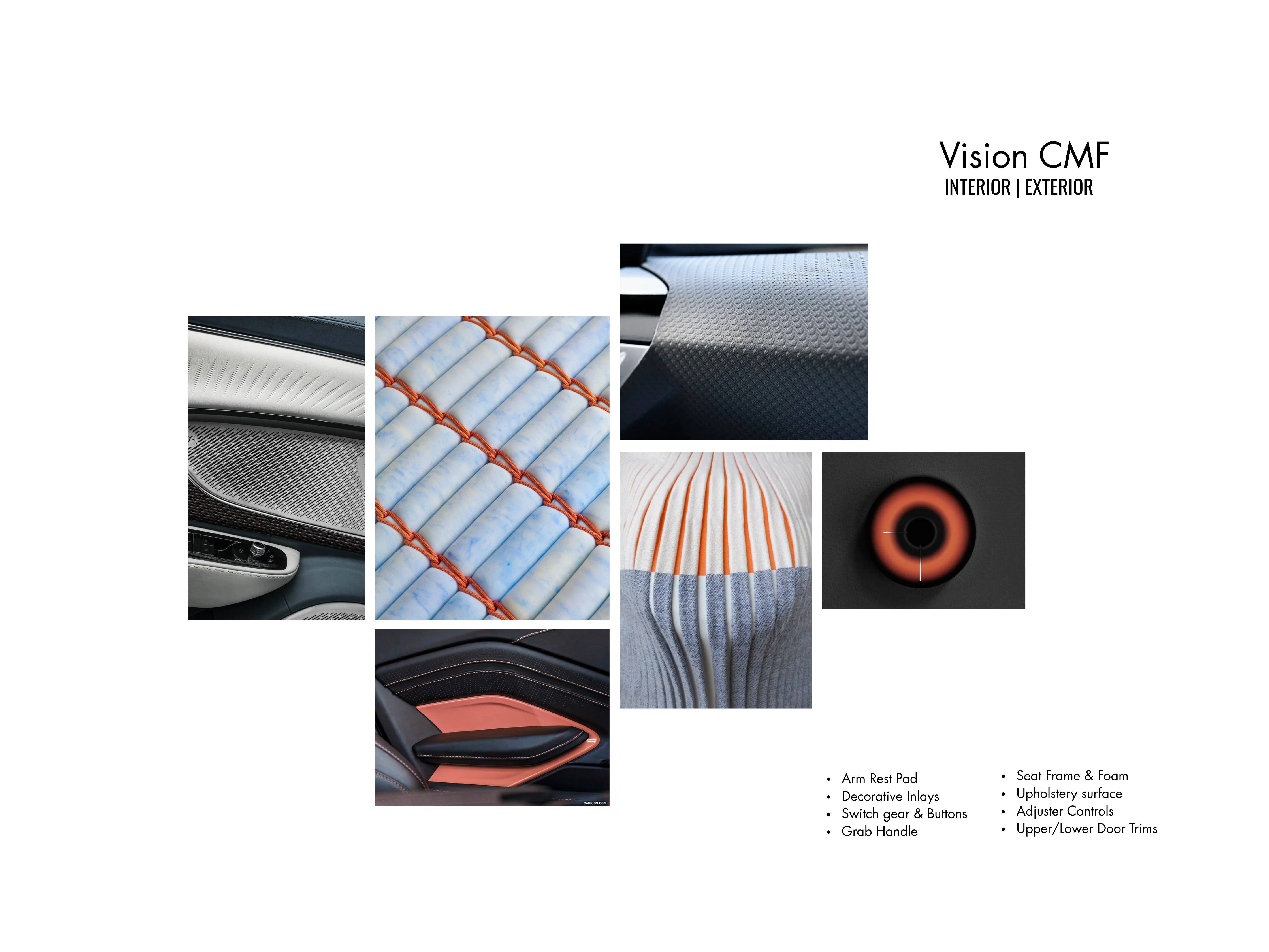 Color, Material & Finish (CMF) strategies for both the interior cabin and exterior body of our next-generation vehicle lineup. This project explores four distinct themes, Tranquil Minimalism, Coastal Slate, Industrial Fusion, and Electric Depths - each designed to evoke unique emotional and sensory experiences while aligning with technical requirements and brand identity.