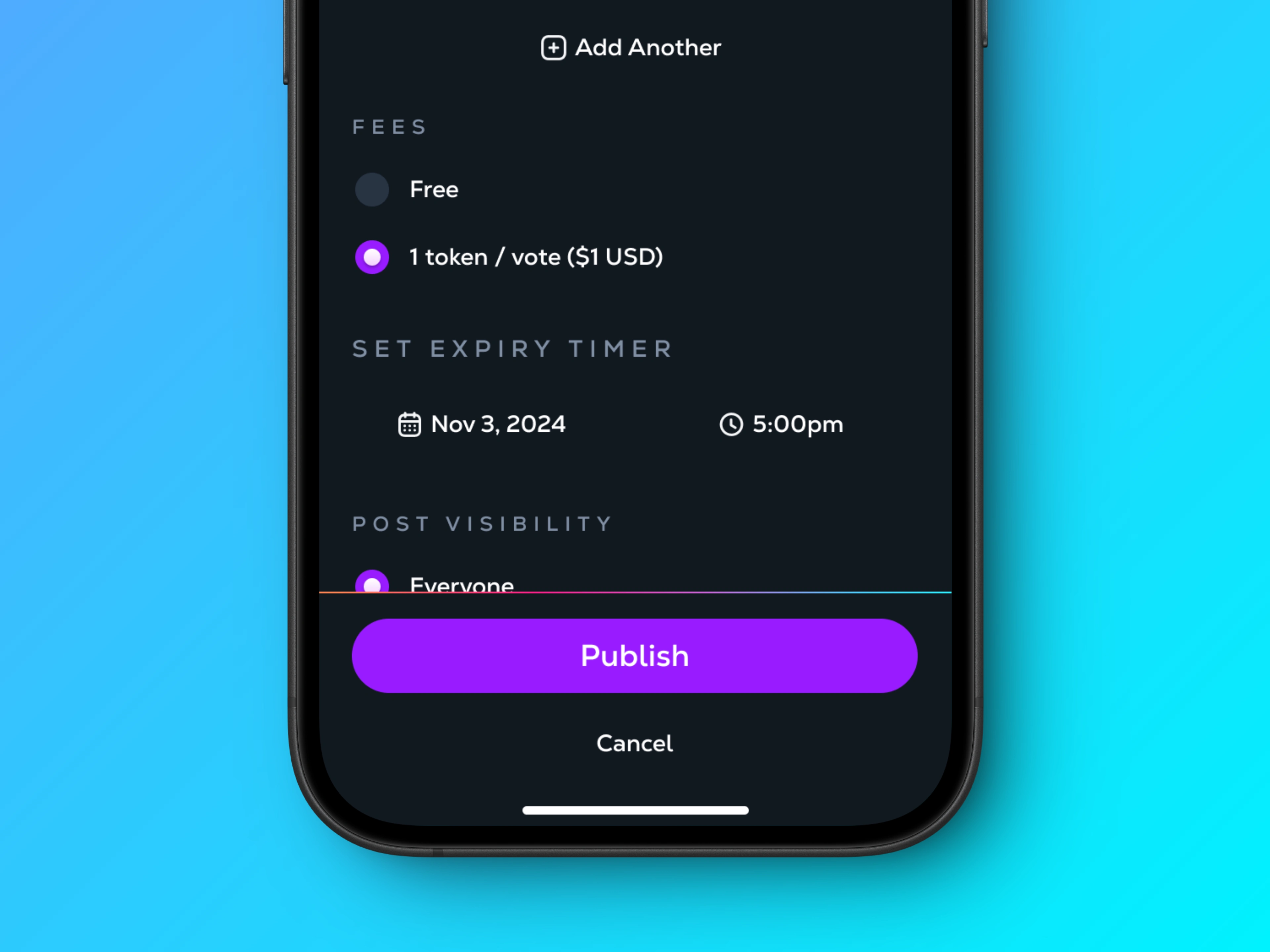 Paid poll publishing and monetization settings screen from the Paid Polls UX Prototype, showing token-per-vote pricing, poll expiration date and time, visibility controls, and publish action.