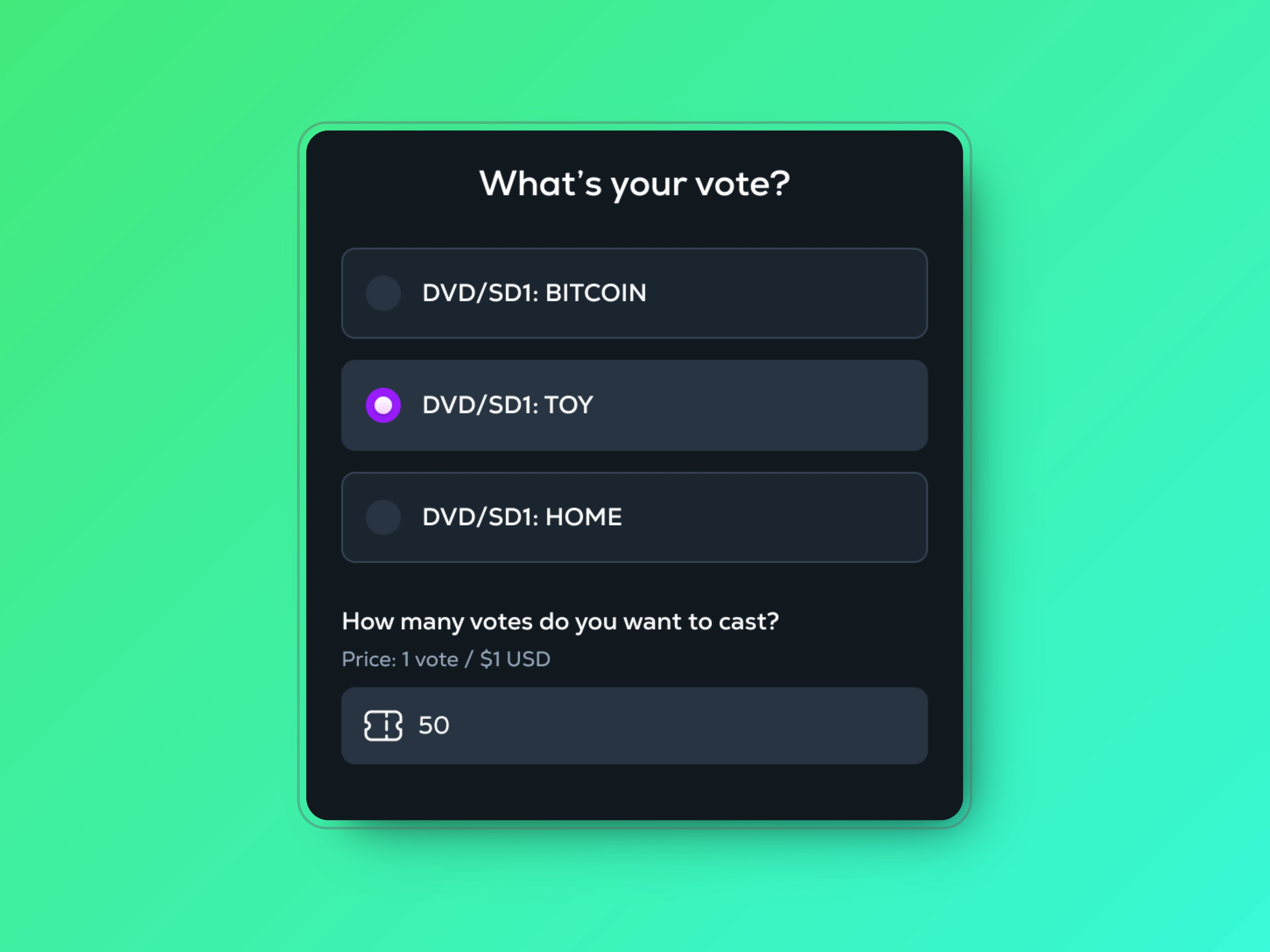 Paid polls voting interface from the Paid Polls UX Prototype for Calaxy, designed by Chadd Weston, showing users selecting a poll option and choosing the number of blockchain-based votes to cast using tokenized pricing.