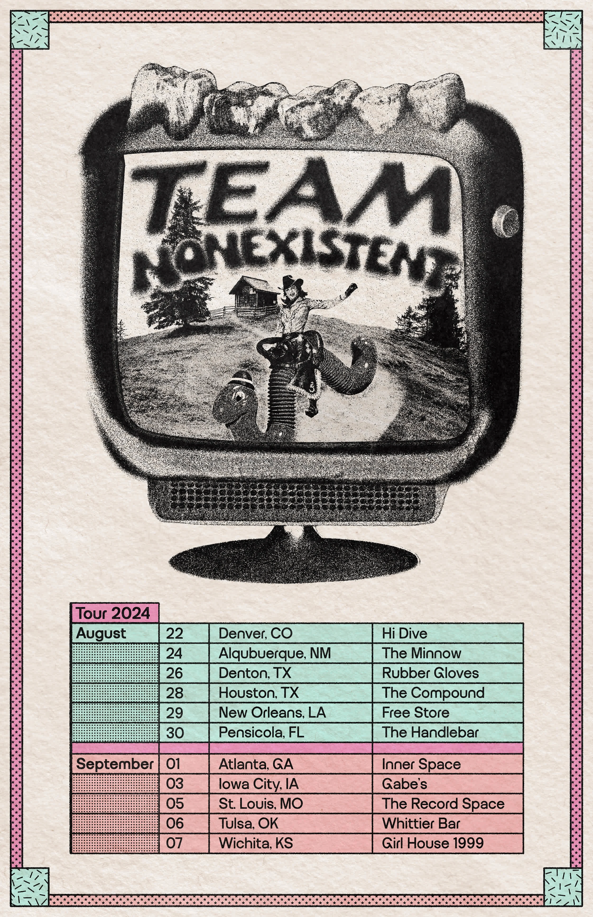 Designed a playful, collage-style tour calendar for Team Nonexistent. Mixed surreal imagery and nostalgic textures for digital and print promo.