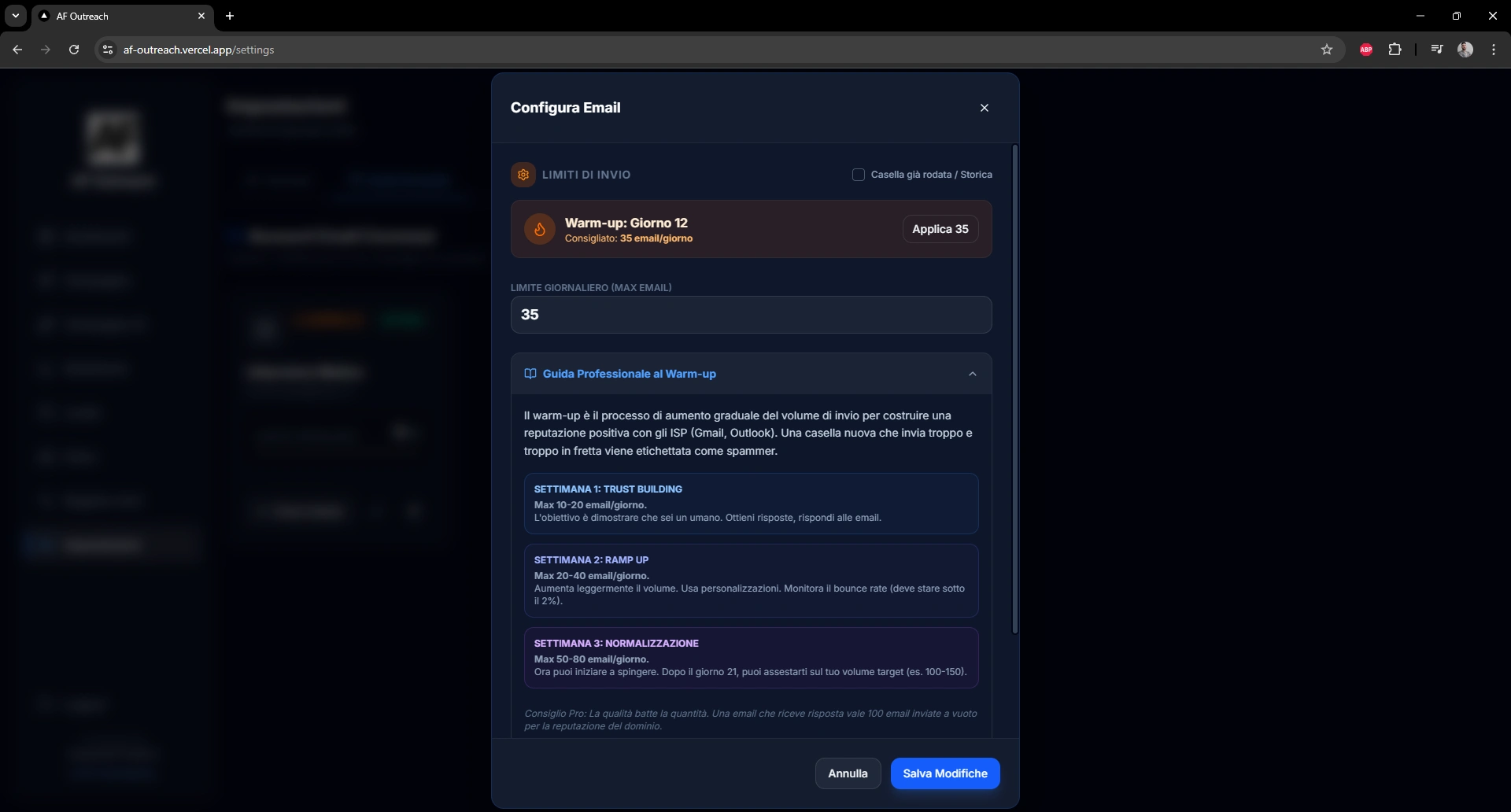 The platform includes built-in warm-up logic with progressive daily limits.