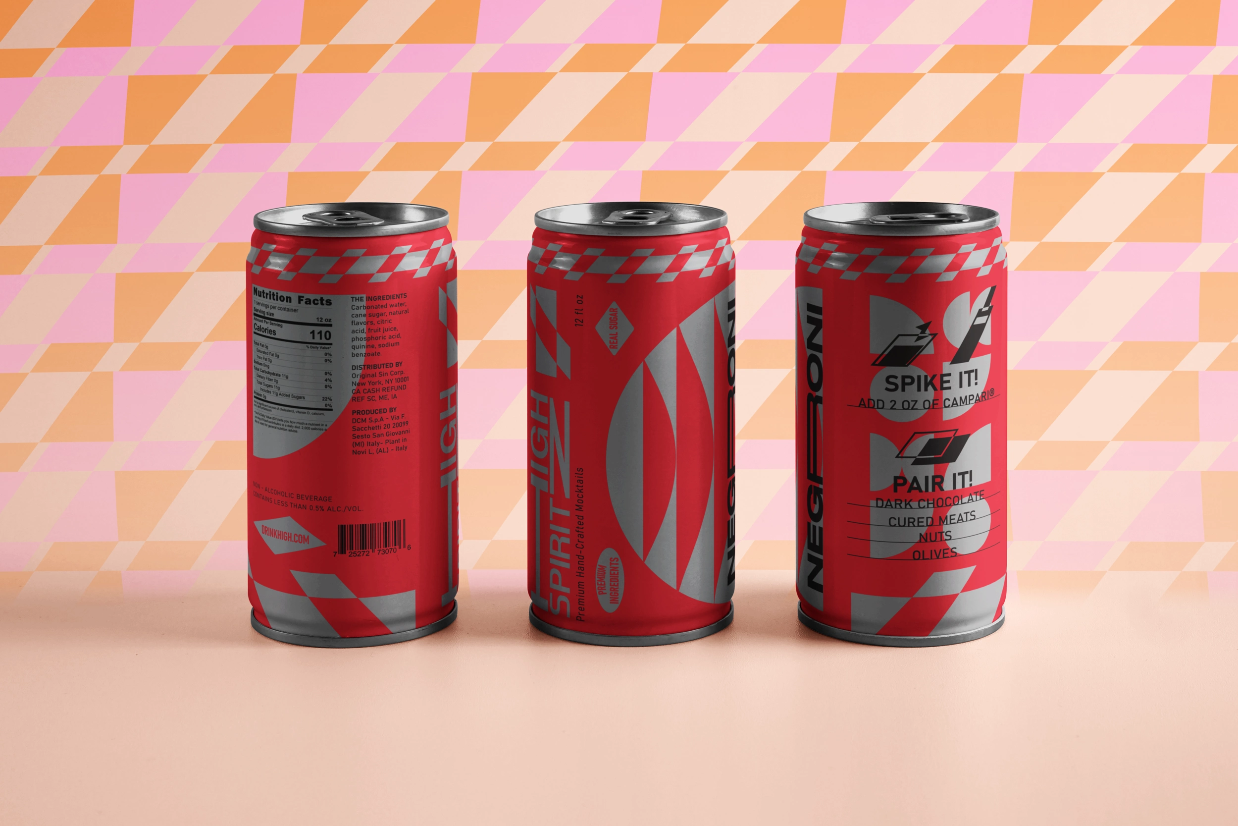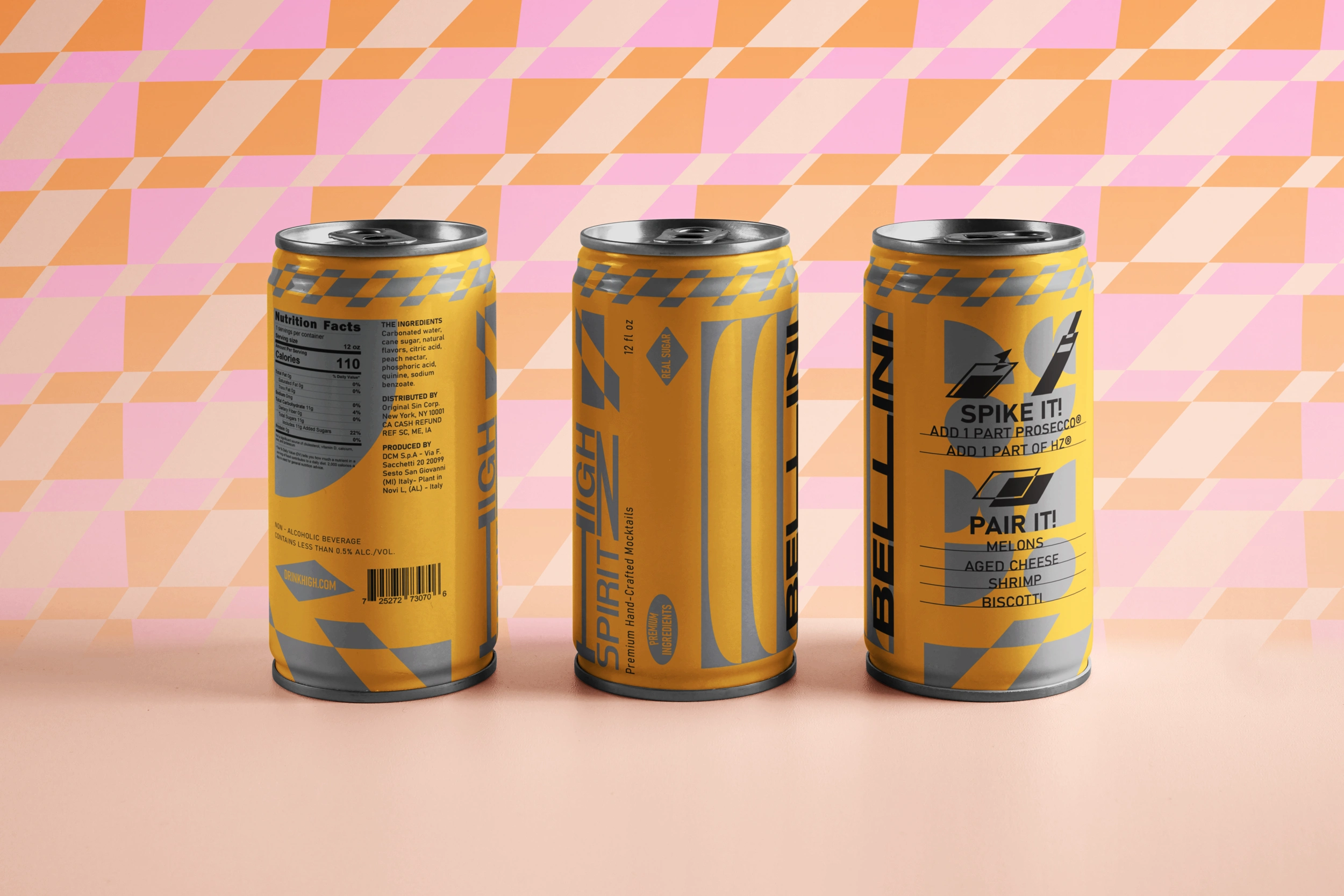 Branding for a high-end mocktail brand aimed at the recently retired, blending Italian vintage charm, Mid-Century Modern design, and Bauhaus simplicity. The wordmark plays with stretched typography, using sharp angles and negative space between the H and Z to create a distinctive mark. Each flavor is color-coded and represented by its own shape, nodding to classic cocktails. The cans include easy “spike it” instructions, making it perfect for anytime, anywhere.