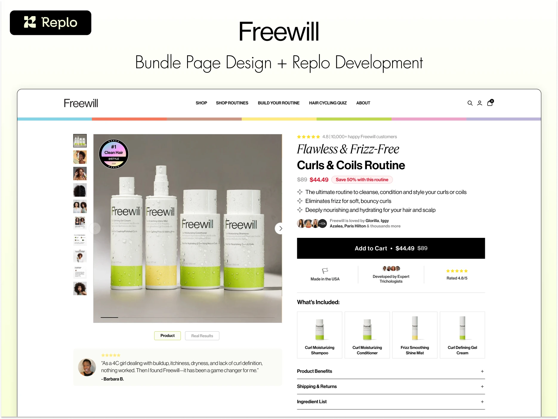 Bundle page for Freewill's Curls & Coils Routine, built in Replo.