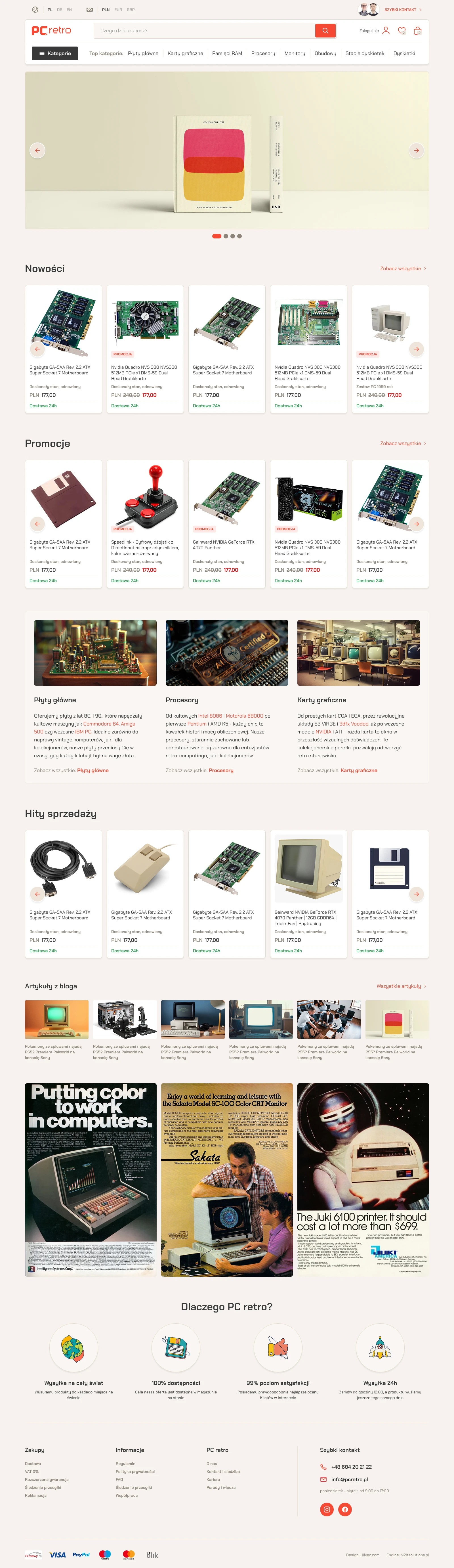 The homepage is all about giving users quick access to key categories, current deals, and educational content. I designed a modular layout with featured promotions, product highlights, retro-themed blog articles, and trust-building USPs (“Worldwide shipping,” “100% availability,” etc.).No fluff — just a sharp, informative overview.