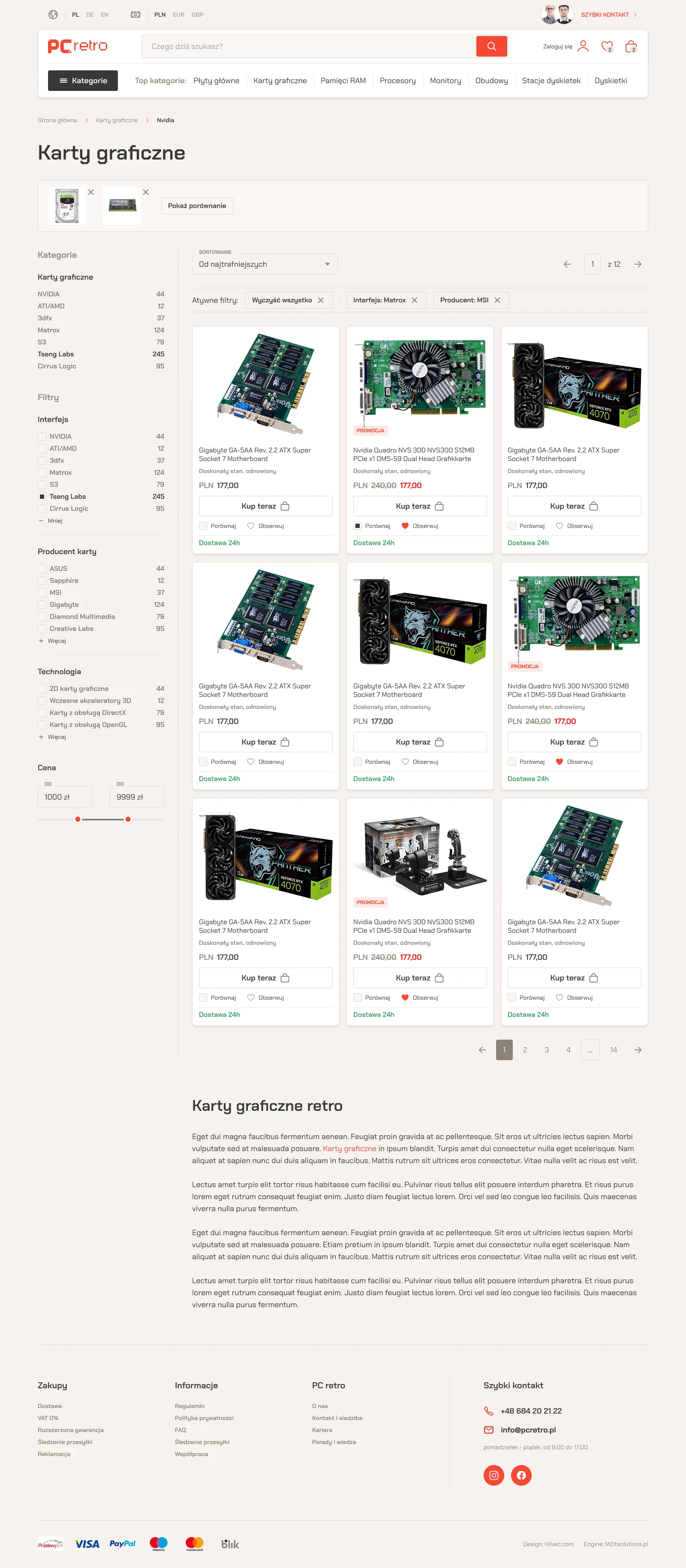 With dozens of brands, interfaces (AGP, PCI, ISA), and formats to sort through, the product listing page required a clear and robust filter system. Users can narrow down by chipset, interface, era, and even specific use cases like DirectX/OpenGL support. The layout is optimized for fast scanning with strong visual hierarchy and consistent card structure.