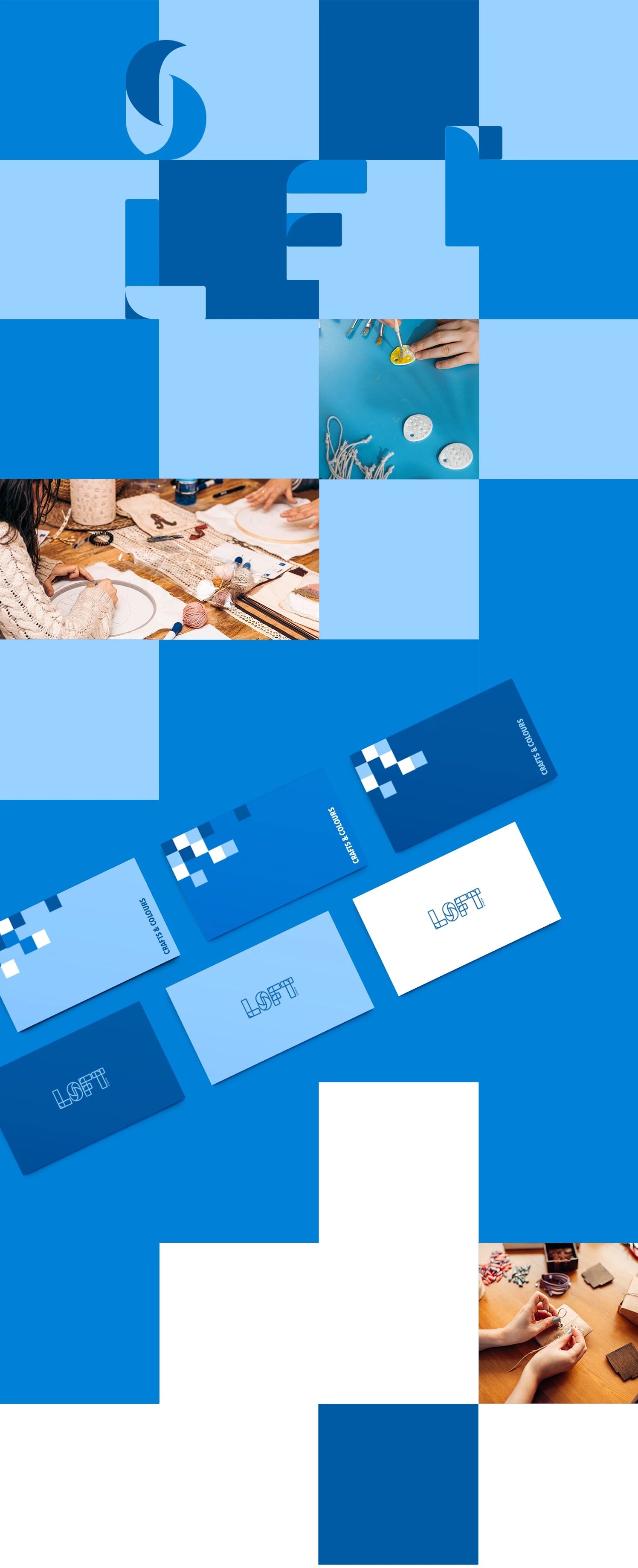 Corporate identity design for Loft Studio, an art space specializing in handcrafted objects and creative craftsmanship. The goal was to create a distinctive logo that reflects the studio’s passion, care, and attention to detail, while introducing a subtle sense of playfulness to reflect the creative nature of its work. A palette of blue shades was chosen to evoke trust, calmness, and artistic depth, giving the brand a soft yet confident presence.