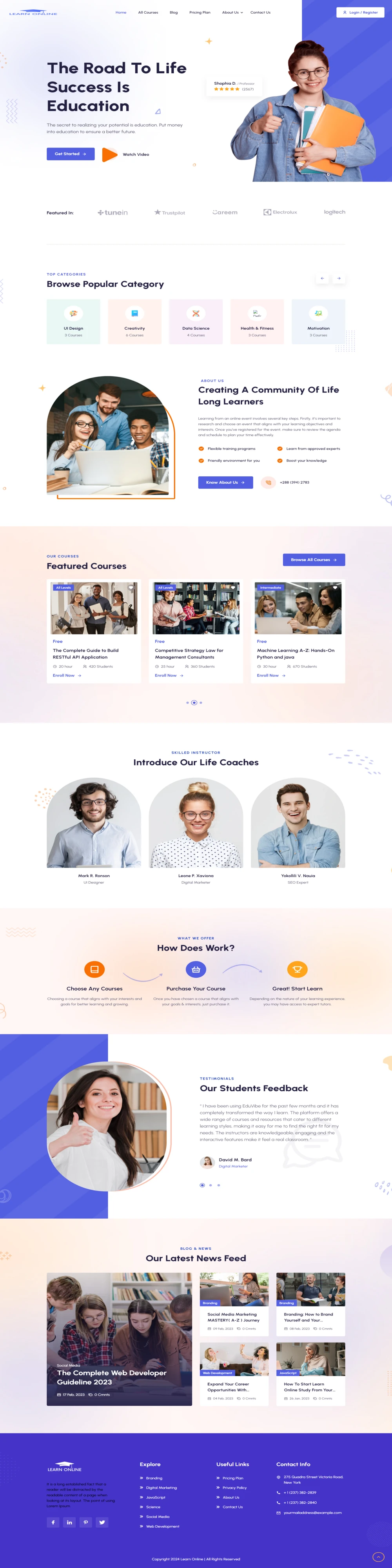 A responsive e-learning site with courses for all levels, featuring interactive lessons, expert tips, and projects to help users master web design skills.