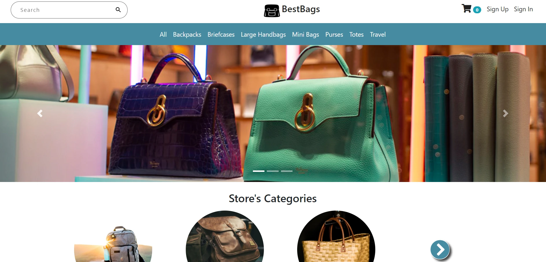 The application displays a virtual bags store that contains virtual products and contact information.
