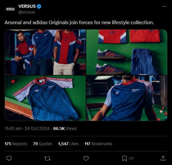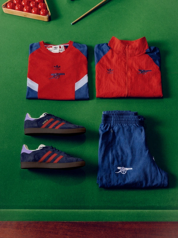 The Adidas Originals Arsenal collection for 24/25 sees a range of track tops, bottoms, tee-shirts, hoodies and special pair of Gazelles, all presented in co-ordinated shades of blues and reds, topped off, of course, by the Trefoil logo, which is paired up with the Gunners’ stripped back cannon crest.