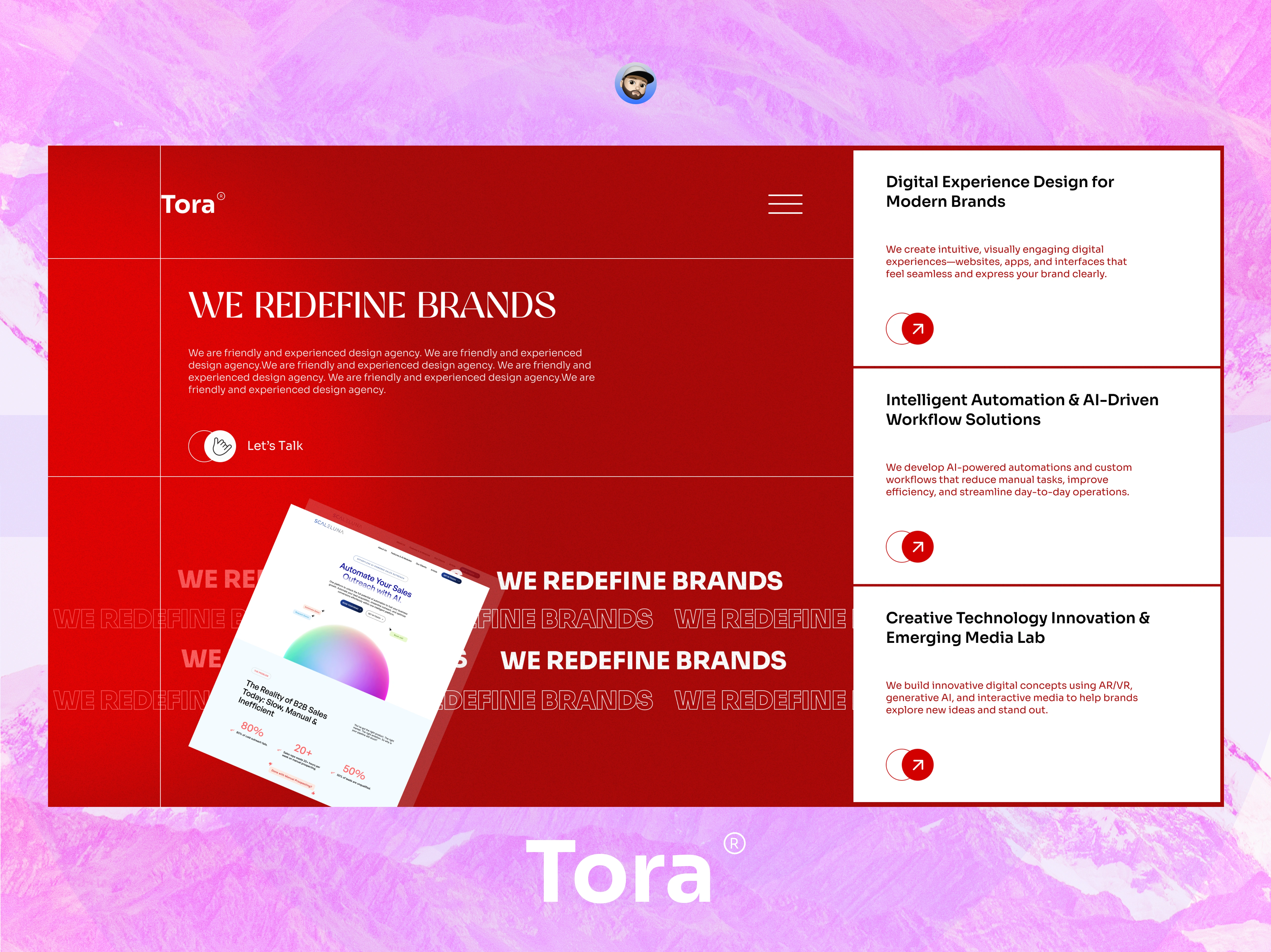 The final landing page positions Tora as a confident, modern branding agency that understands both design and business impact. It captures attention quickly, communicates value clearly, and guides users toward action—without unnecessary noise.