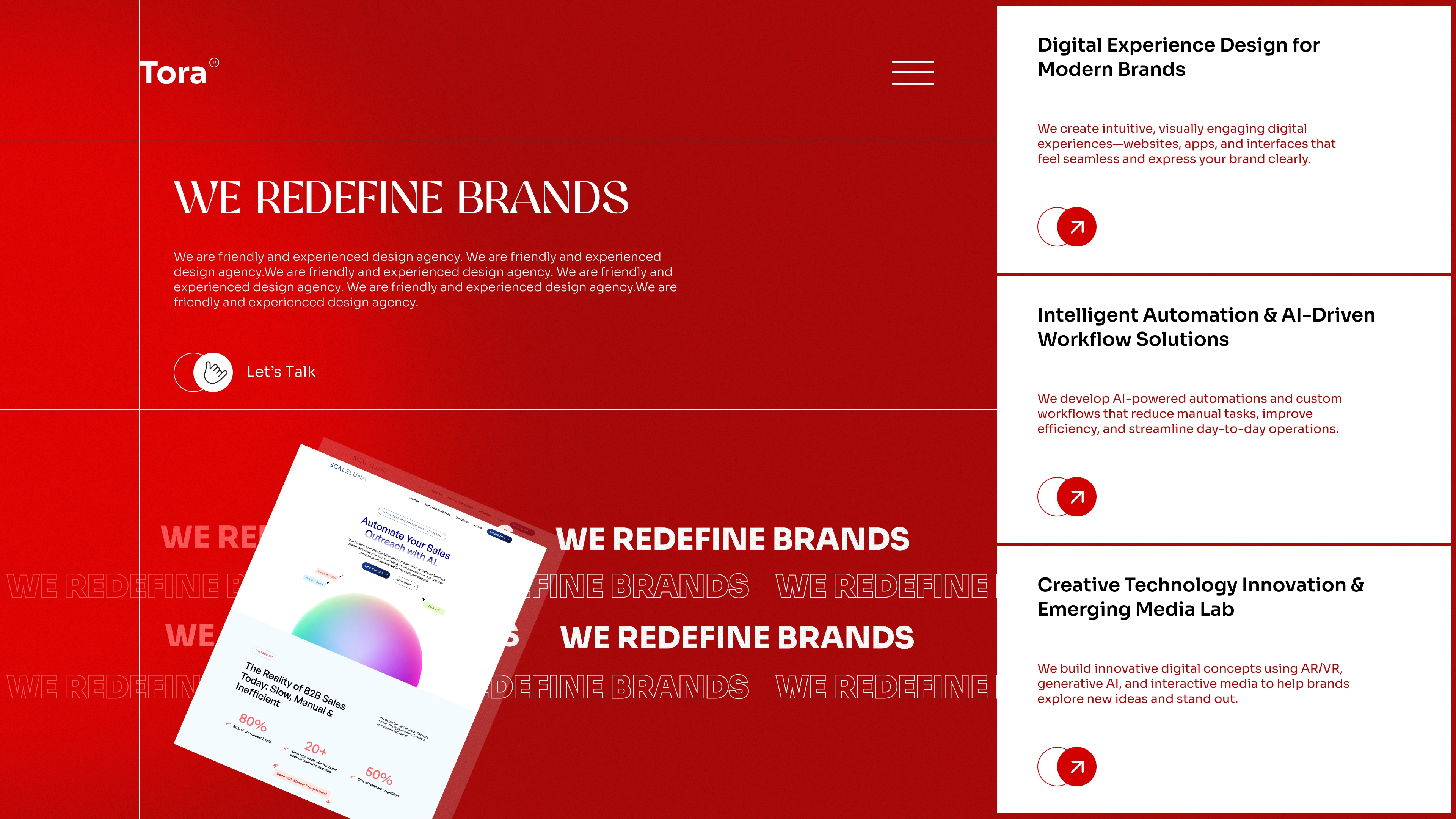 Tora is a branding agency focused on modern, strategic design. The objective of this project was to create a high-converting landing page that not only showcases Tora’s creative strength but also functions as a focused growth tool—turning visitors into qualified leads.