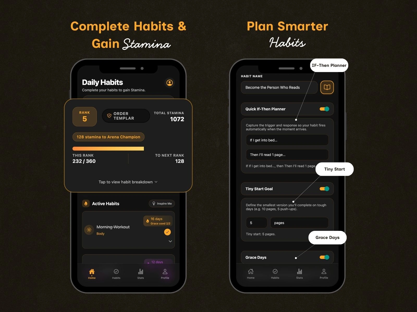 Stamina reframes habit tracking as an energy and progression system. Users build daily habits, earn stamina points, and level up through ranks, making consistency feel rewarding rather than repetitive.