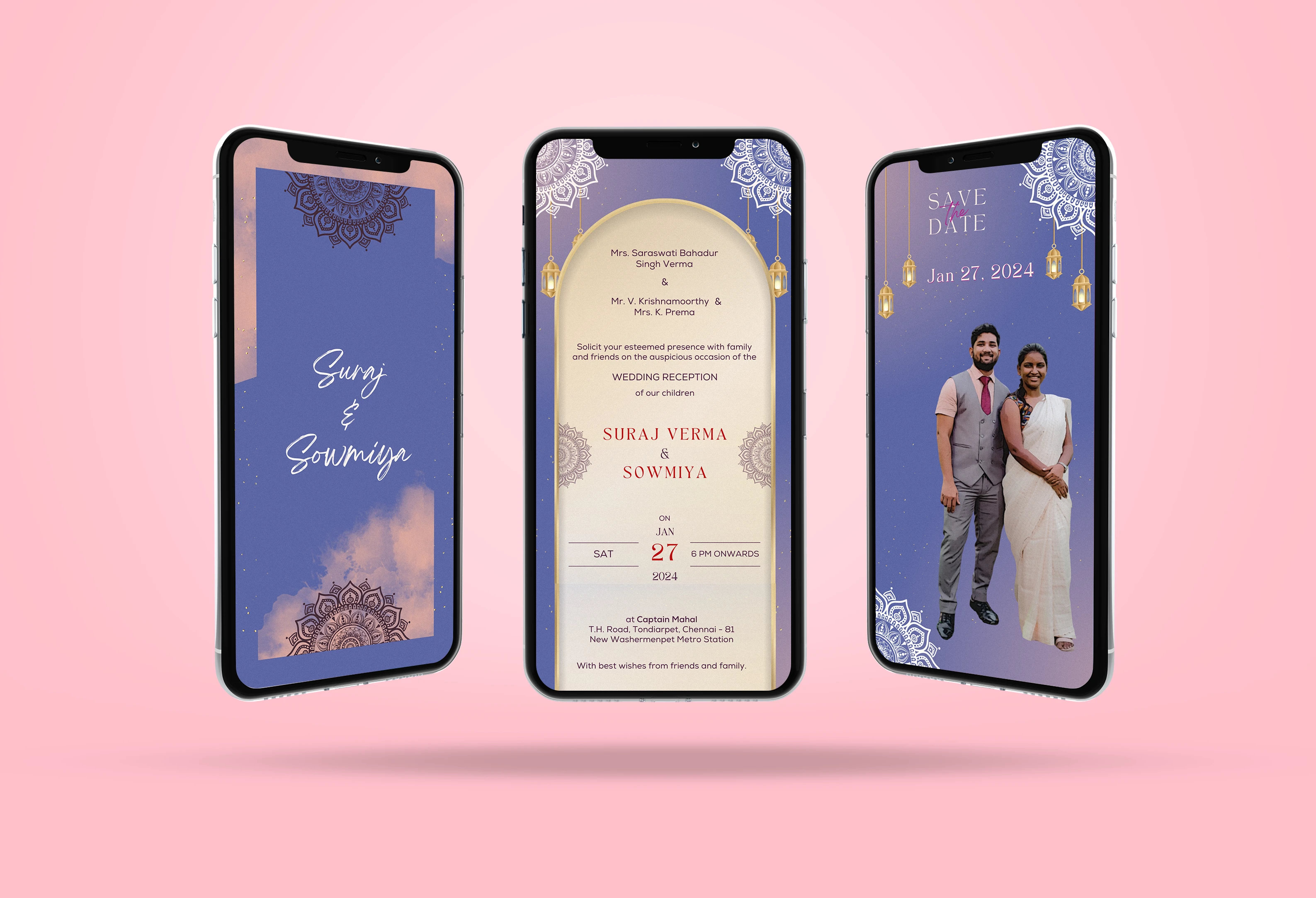 Suraj and Sowmiya sought a personalized digital wedding invitation, reflecting their cultural heritage and dreamy, romantic style. This project showcases a Mandala-themed design with soft, dreamy hues, capturing the essence of their special day. Designed exclusively for digital distribution, it seamlessly integrates tradition and modernity, setting the perfect tone for their wedding.