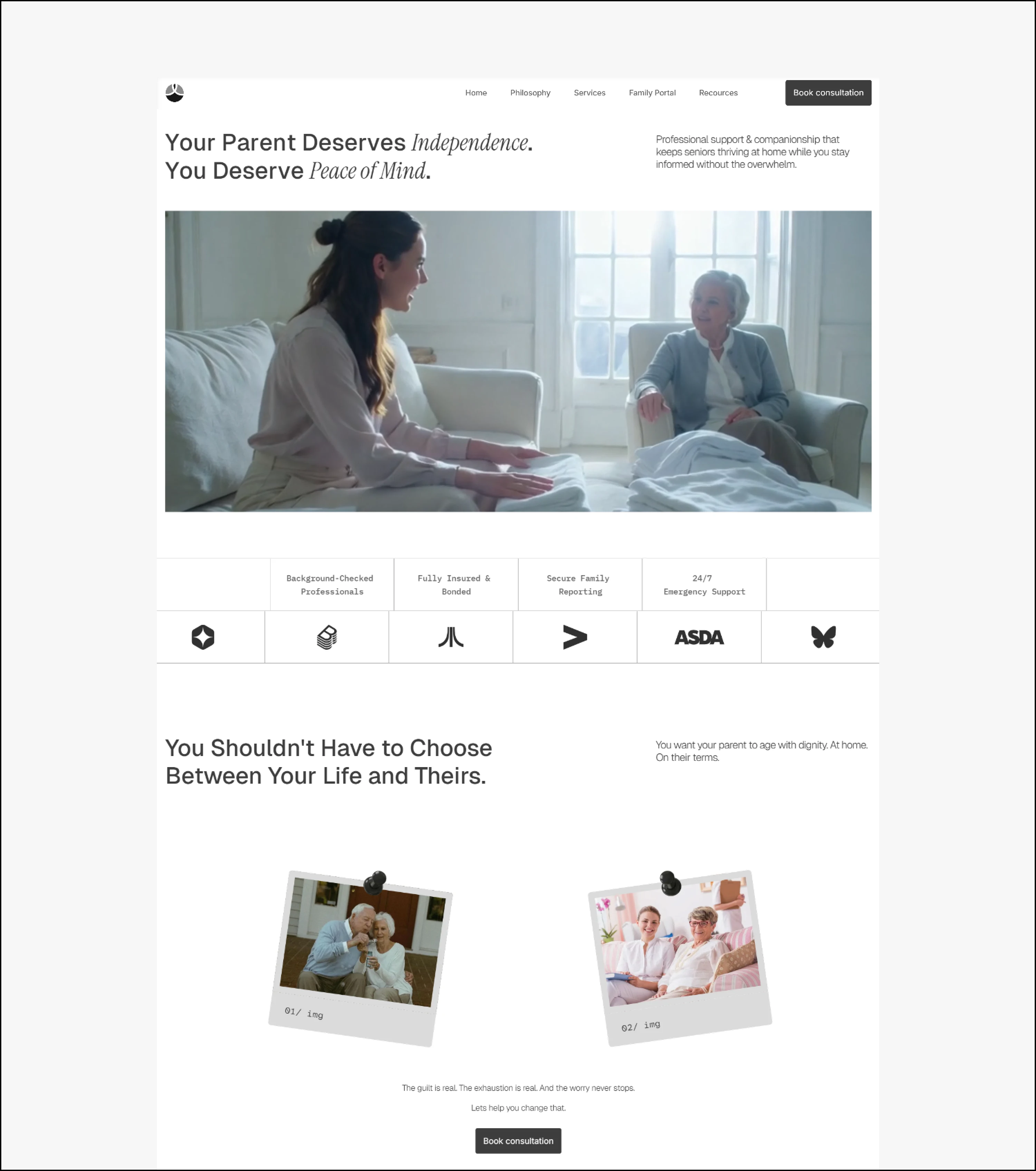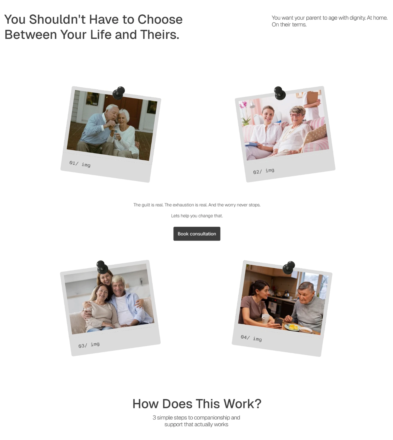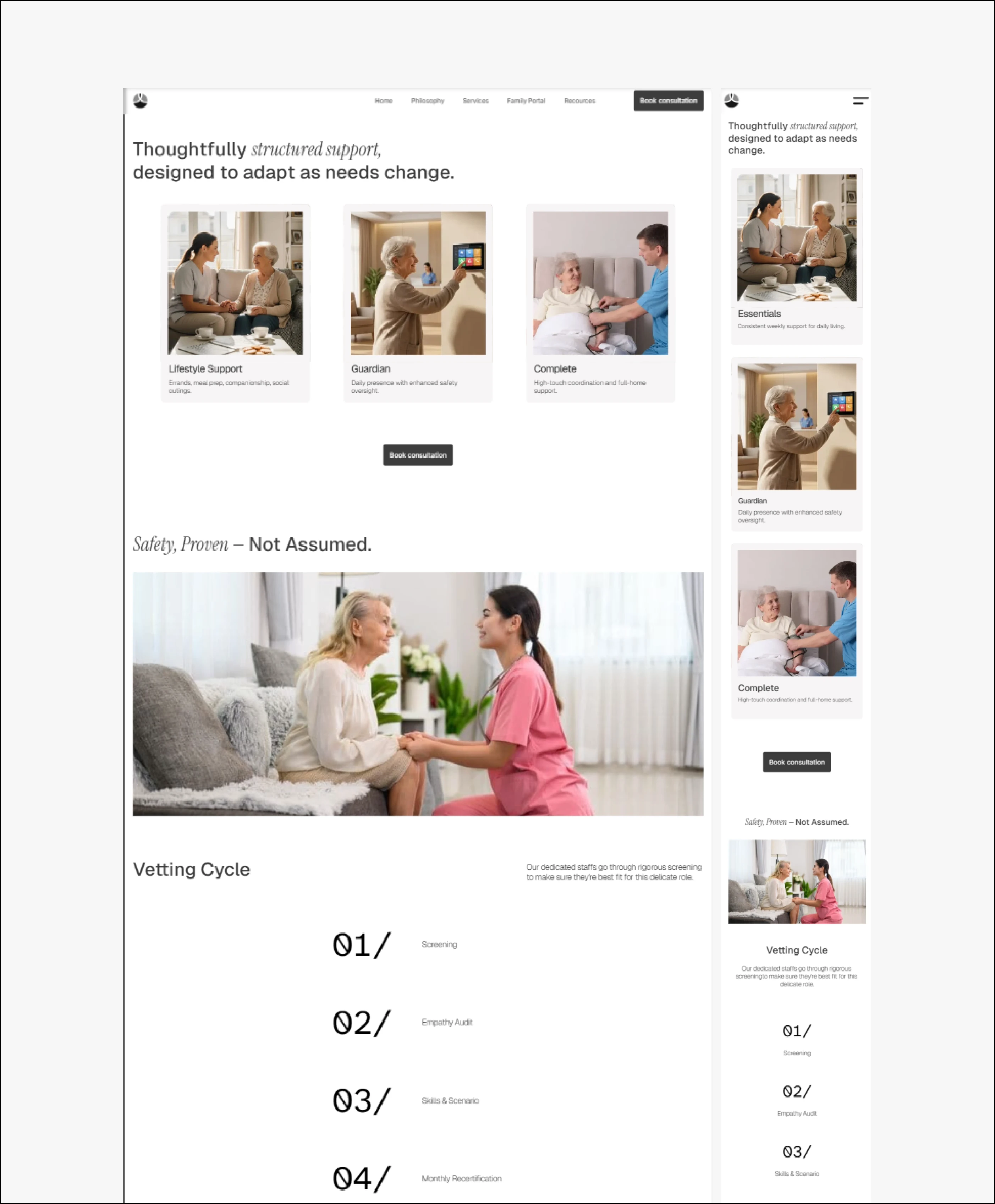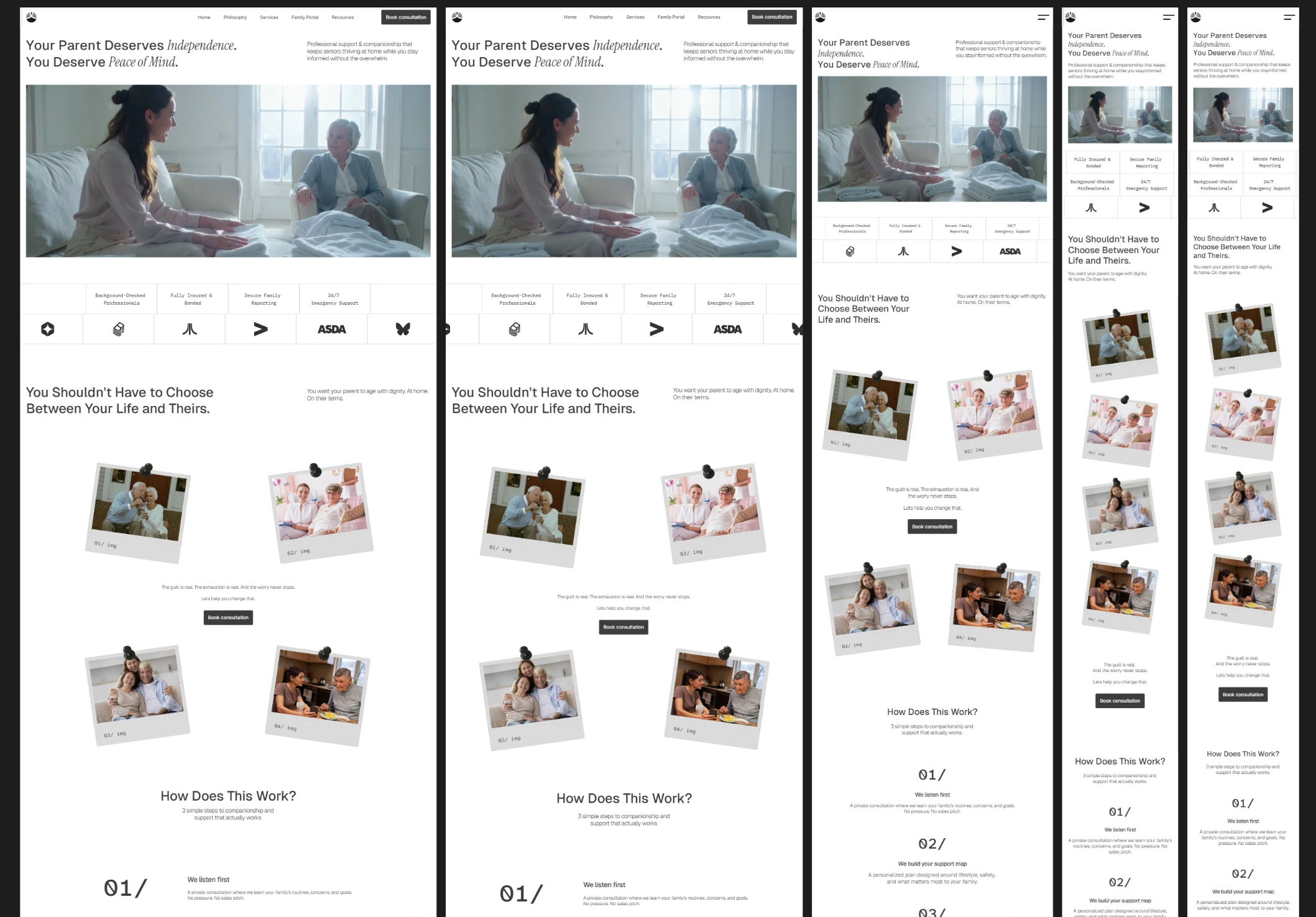 The copy came first. Before any layouts were touched, I mapped the emotional journey of the actual user: the guilt, the exhaustion, the fear of making the wrong call. Every page was structured around that. Hero sections lead with how the reader feels, not what the service offers. Trust signals are placed exactly where hesitation lives — not buried in a footer. The CTA never pressures. It offers clarity.