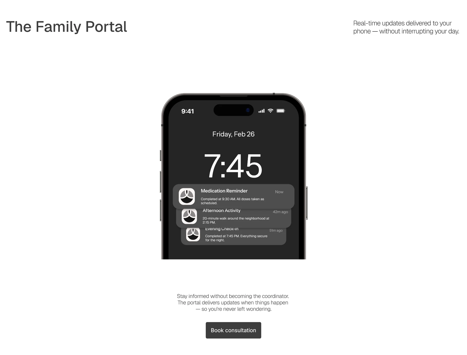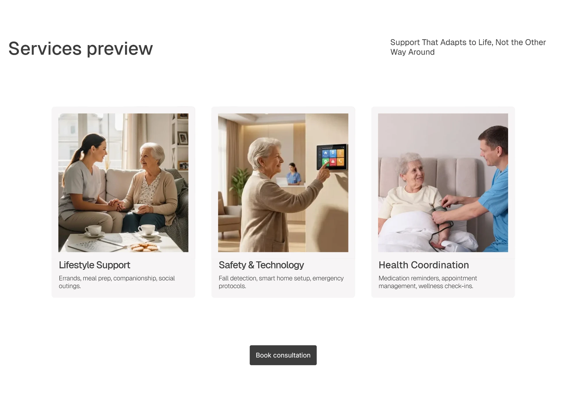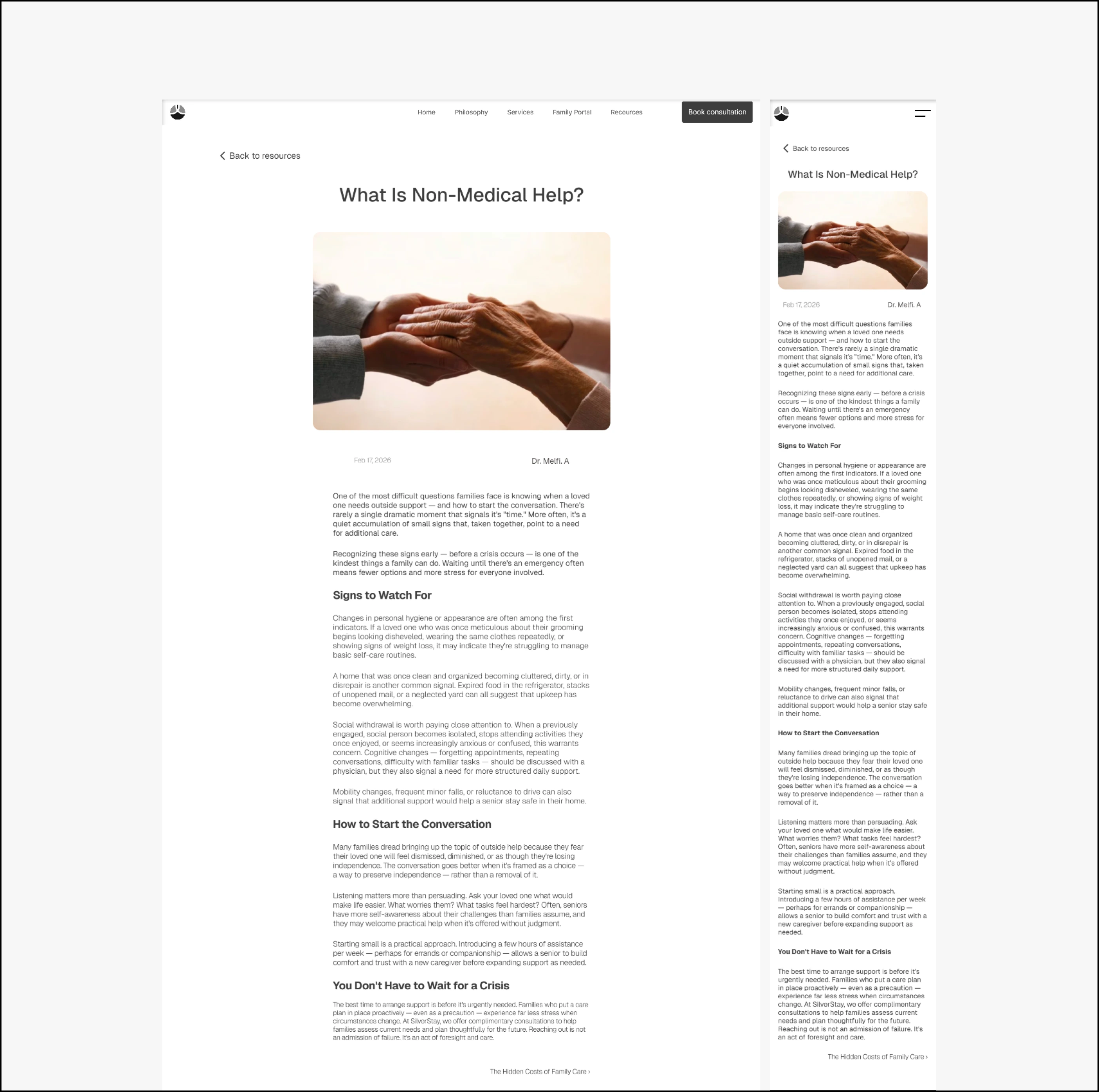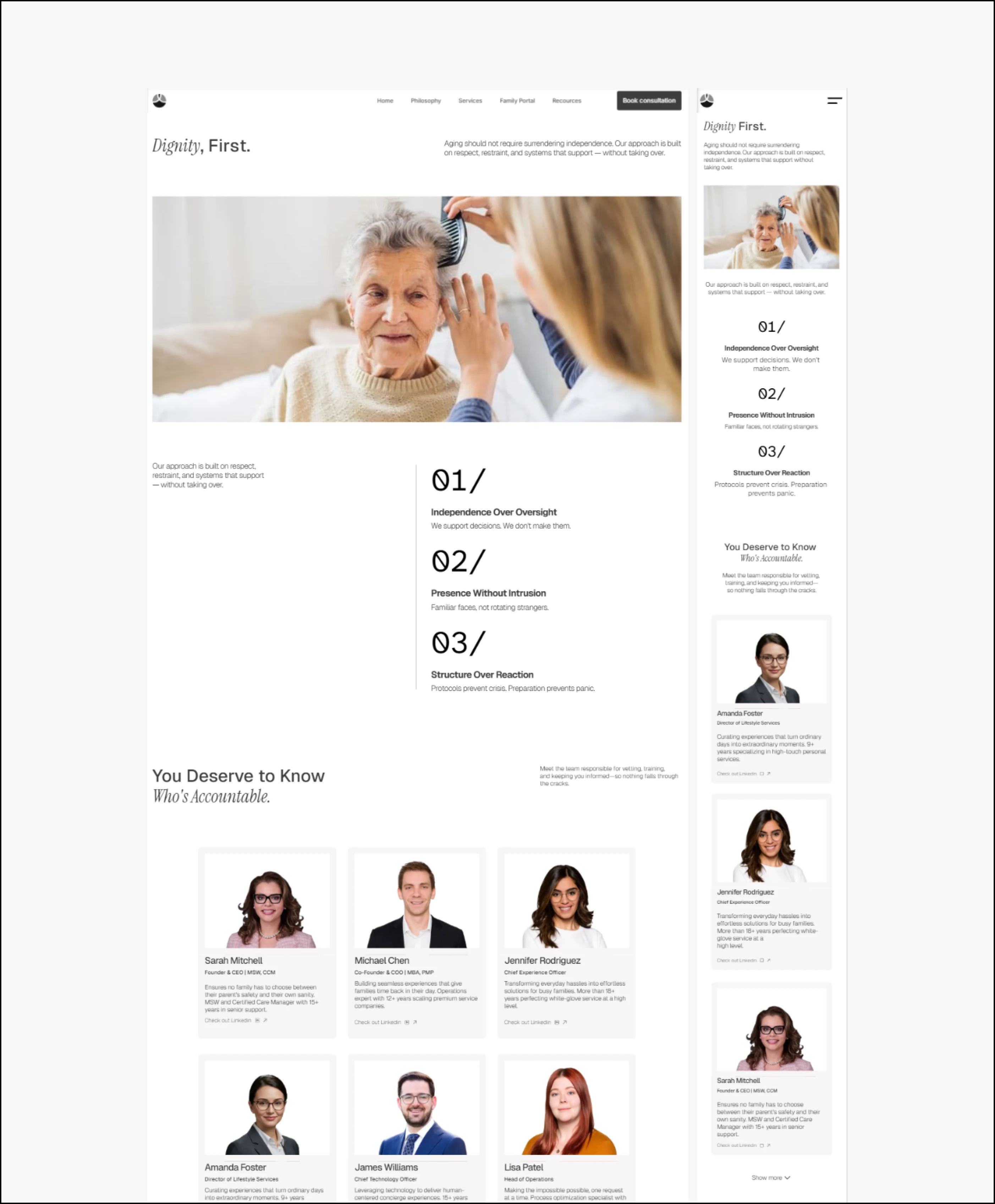 The copy came first. Before any layouts were touched, I mapped the emotional journey of the actual user: the guilt, the exhaustion, the fear of making the wrong call. Every page was structured around that. Hero sections lead with how the reader feels, not what the service offers. Trust signals are placed exactly where hesitation lives — not buried in a footer. The CTA never pressures. It offers clarity.