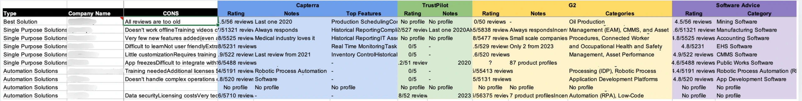 This document compares key competitors on a variety of different review sites, pulling key insights around pain points and overall customer satisfaction.