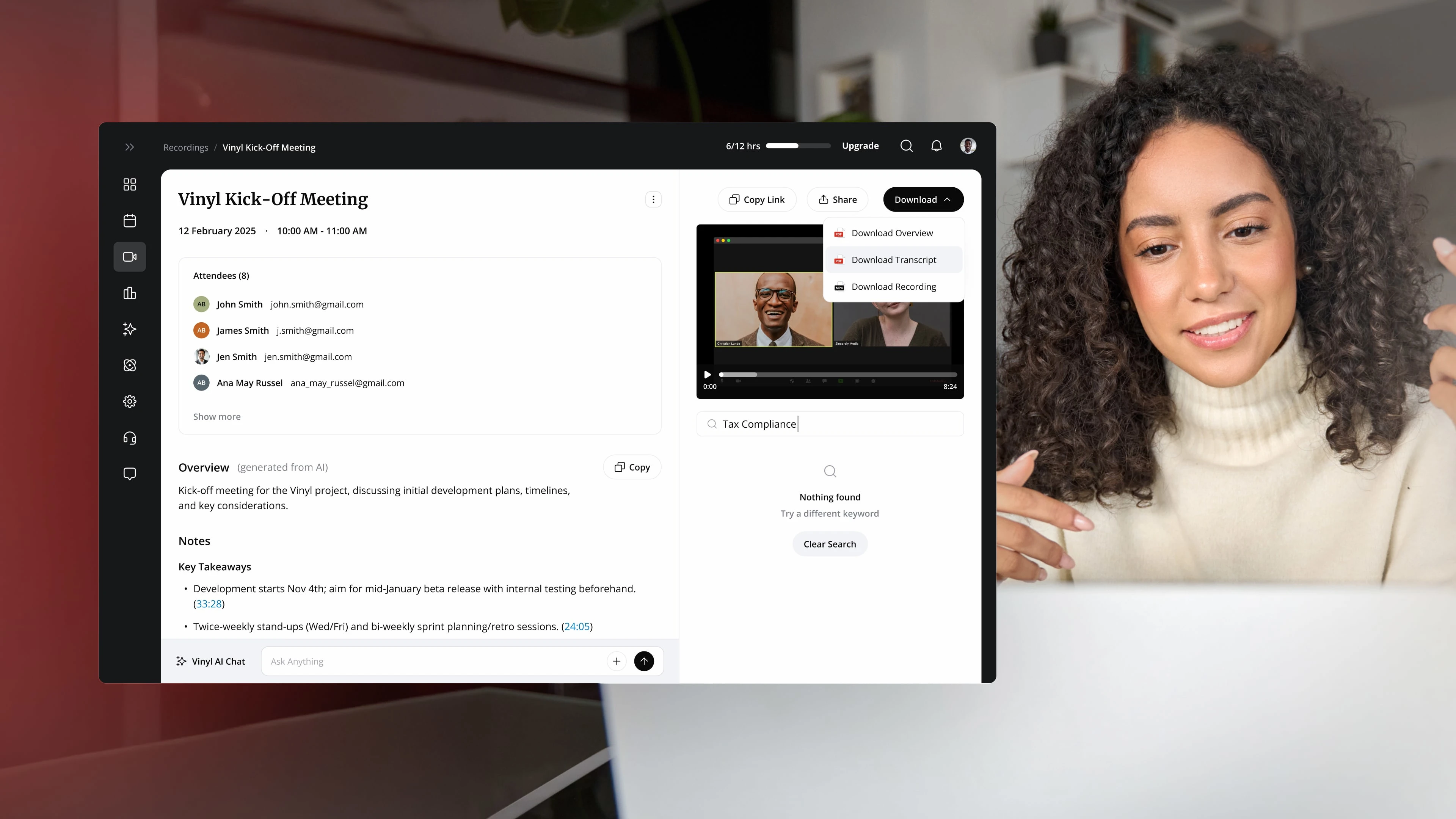 With ambitions to redefine how users interact with their recorded content, Vinyl partnered with Good Fight Creative Co. to overhaul their web app experience. The goal: introduce a powerful AI chat assistant and a robust CRM + tagging system—while keeping the interface clean, modern, and easy to navigate.