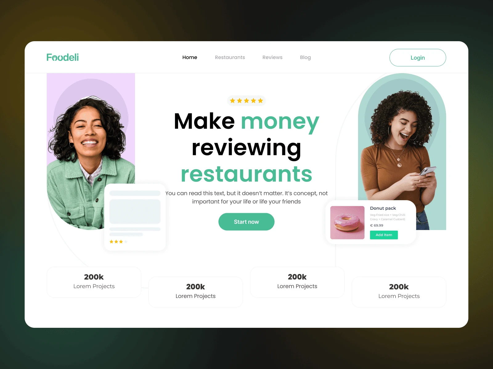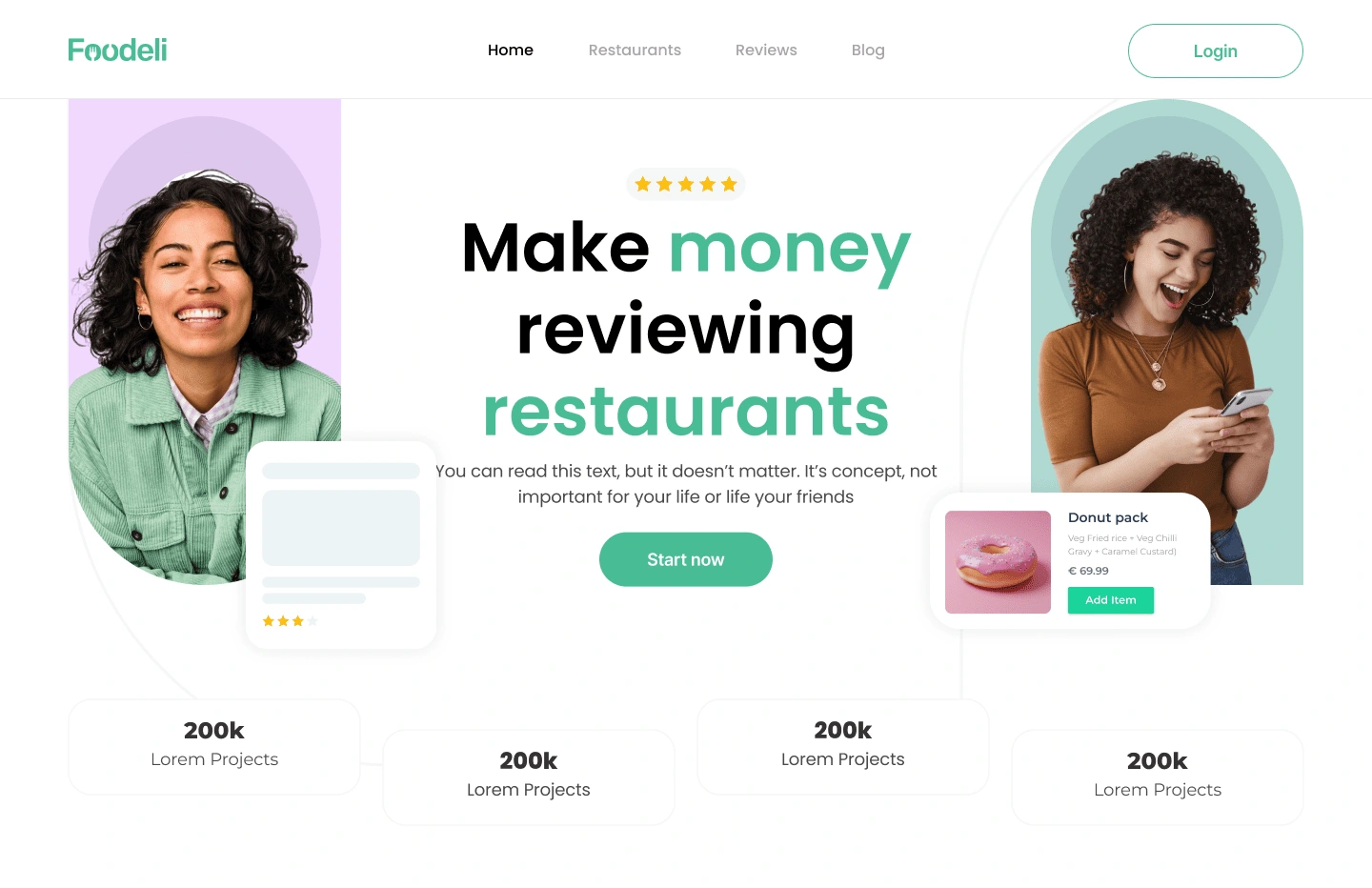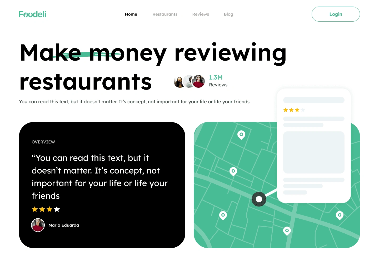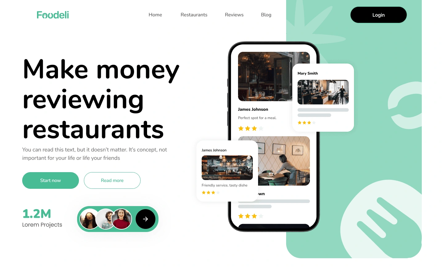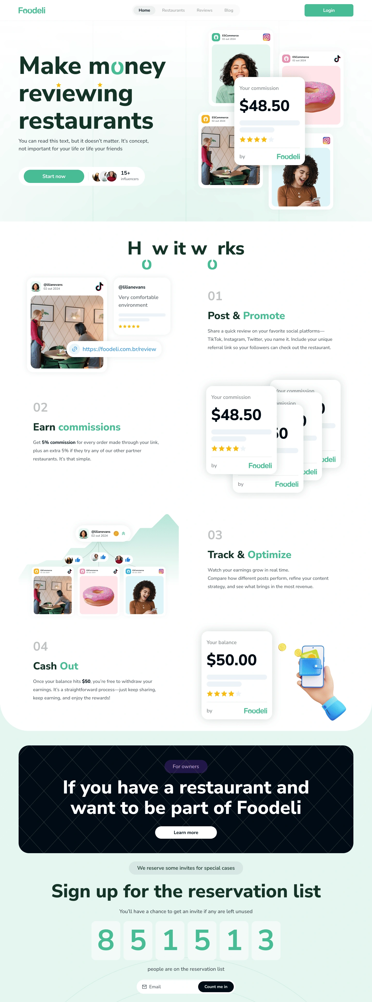 Landing page for a platform where users earn money by reviewing restaurants and sharing content on social media.