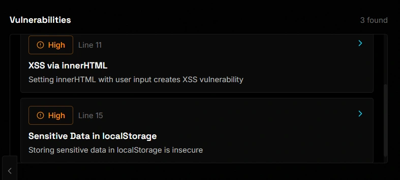 Built dynamic panels for vulnerabilities, severity levels, and secure fix suggestions
