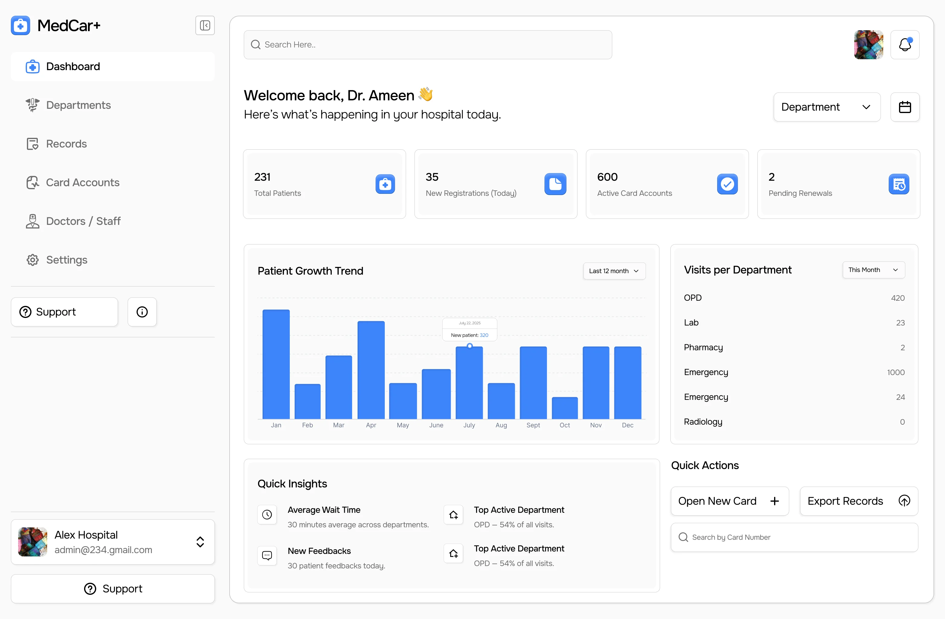 MedCar+ is a digital hospital dashboard built to simplify patient, doctor, and department management within healthcare systems.