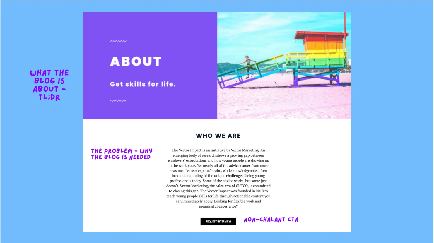 Then, we lead into why the blog is needed — what’s the problem we’re trying to solve — and we wanted to be transparent about who owned the website.