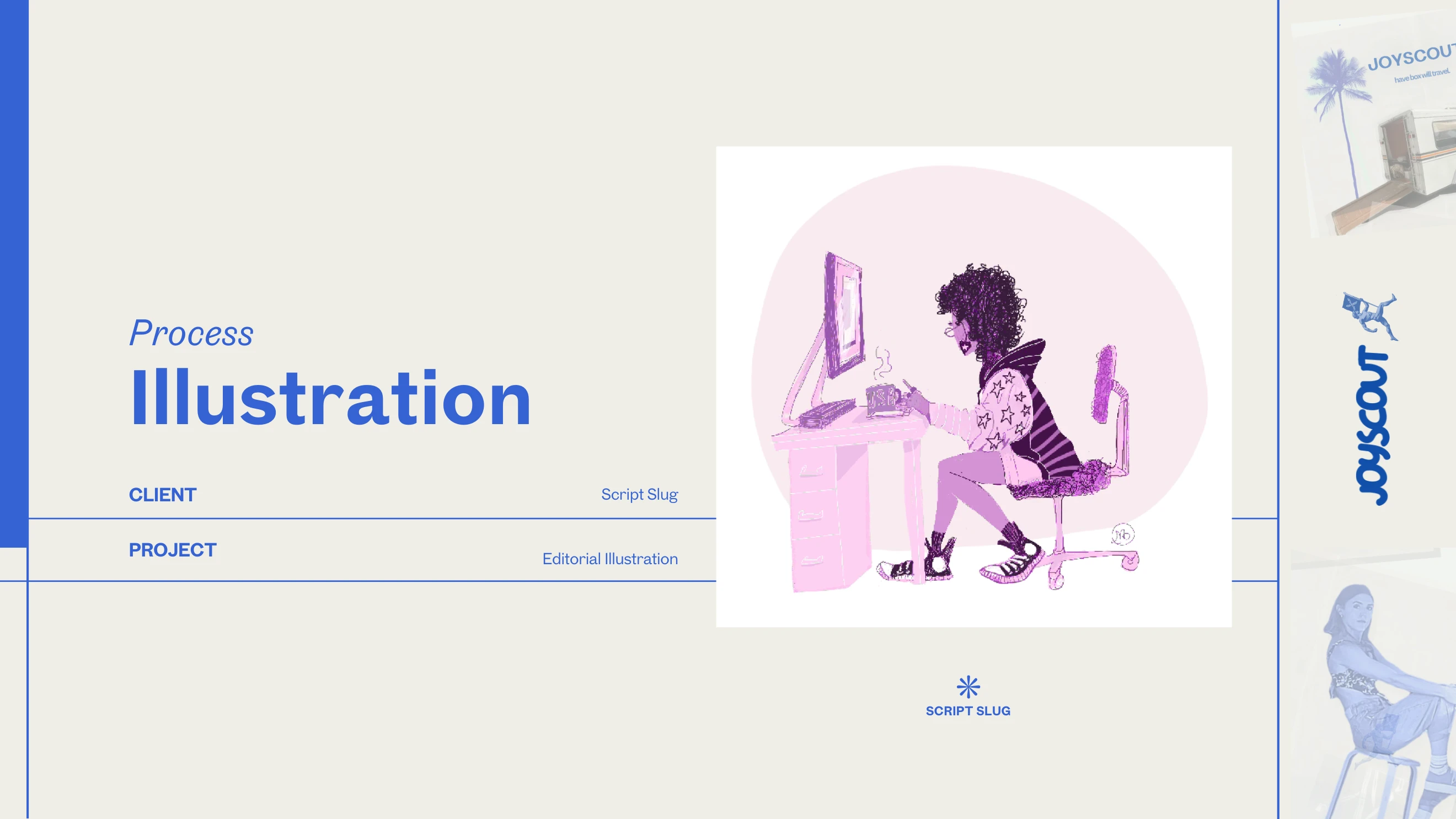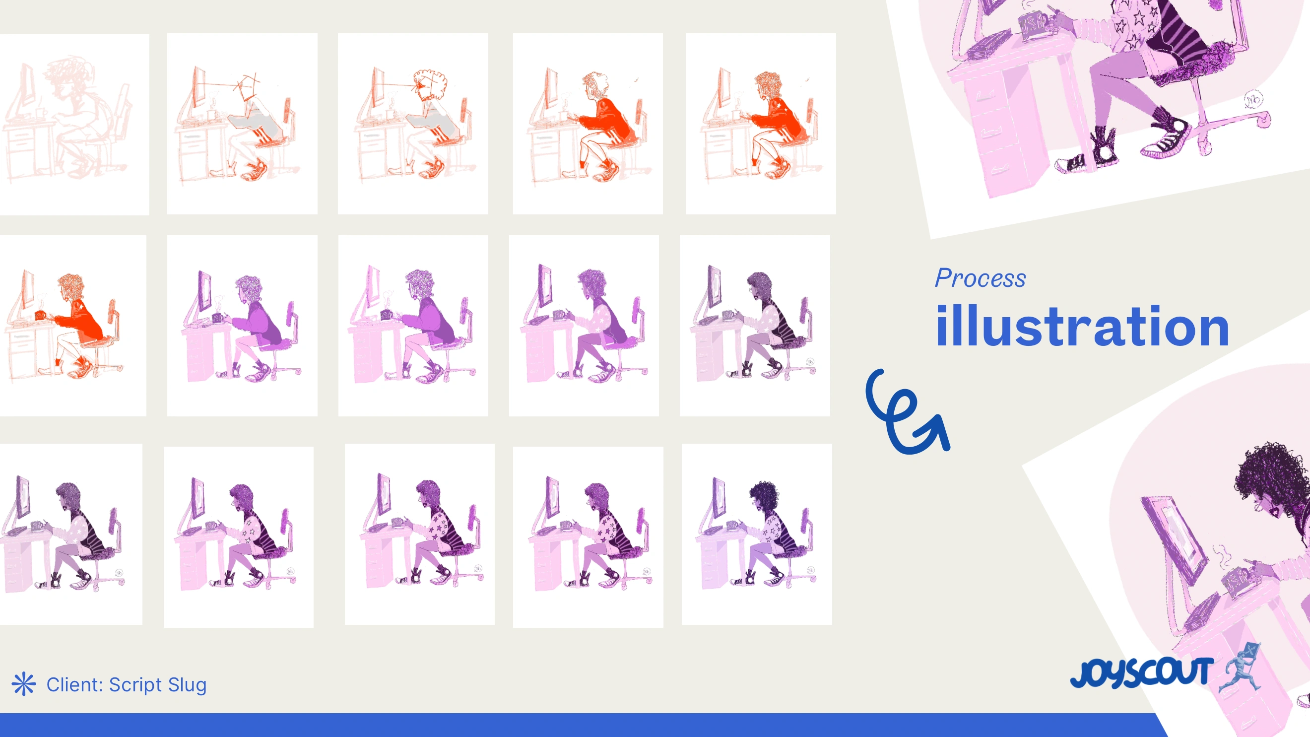 Notice how the first frame Begins with an oversized frame and exaggerated proportions and slowly begins to create texture, and refined shape. The color theory slowly starts to make itself known as the character’s wardrobe gets more identity and her shoes and hair more definition.