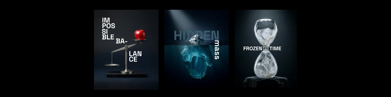 Physics of Silence is a conceptual poster series exploring invisible ideas through minimal metaphors, visualizing balance, hidden mass, and suspended time.