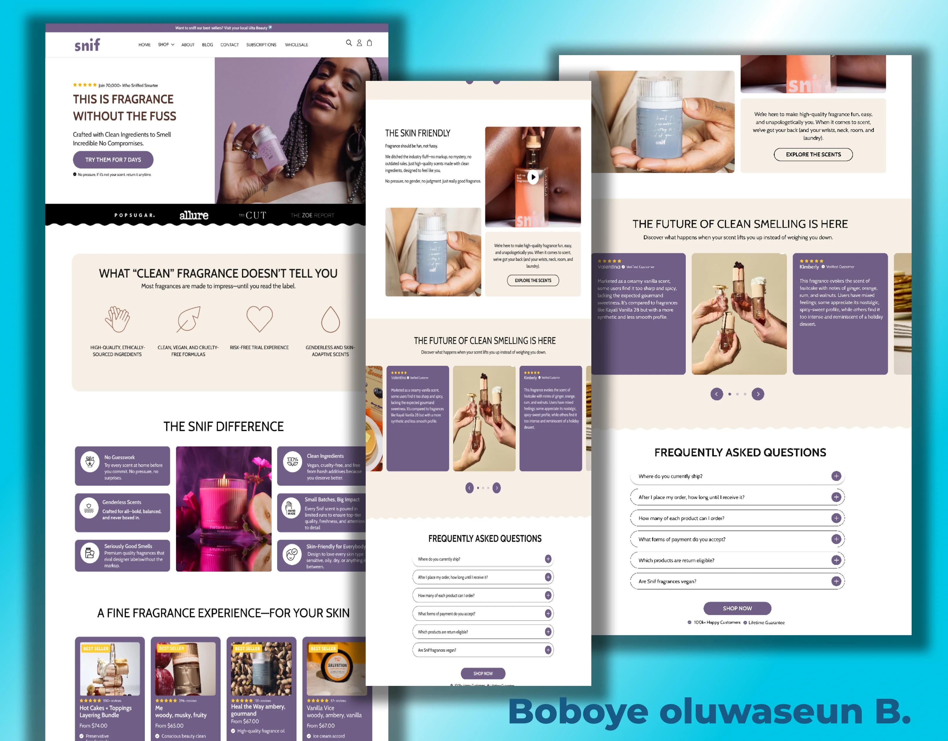 I recently redesigned these homepage for Snif, creating an immersive, scroll-worthy experience that blends bold visuals with an intuitive layout. The refreshed design brings their fragrance first philosophy to life highlighting clean ingredients, convenience, and scents that make a statement.