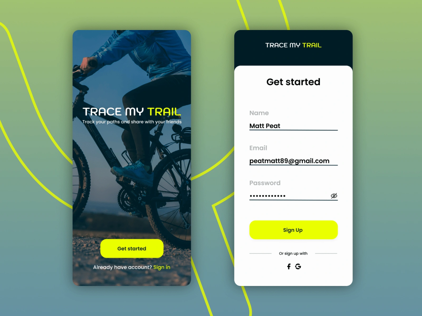 I created this sign up for a UI challenge: I had to design a sign up page, modal, form, or app screen related to signing up for something. I choose to design a sign up for a sport app. This is a bike tracking app, like a social for everyone love to ride off-road!