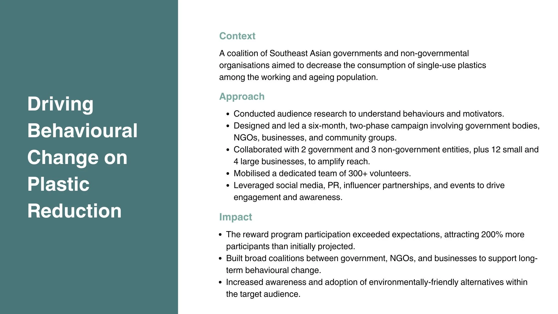 Led SE Asia sustainability campaign: audience insights, stakeholder workshops, multi-channel marketing, influencer and public activations to reduce plastic use.