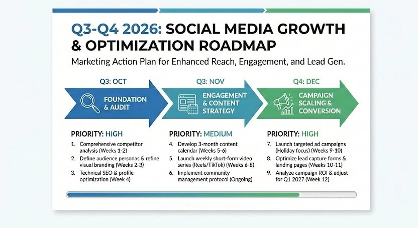 Strategic social media audit identifying positioning issues, content gaps, and performance inefficiencies, with a structured action plan for optimization.