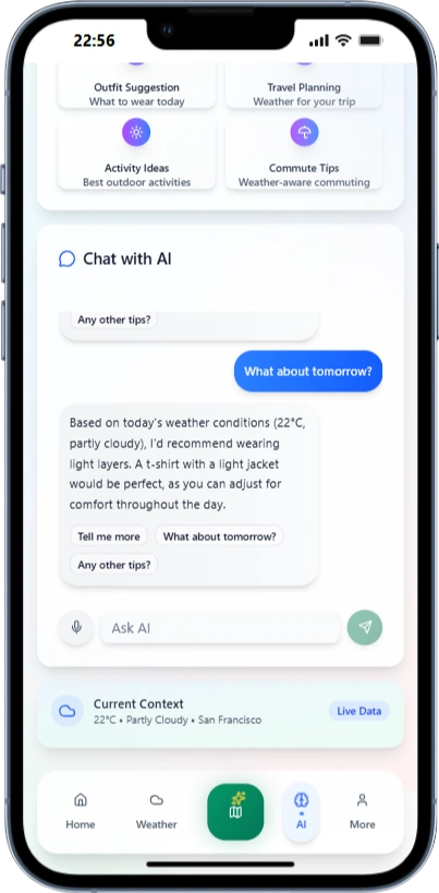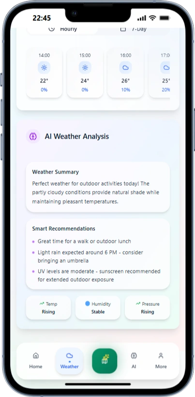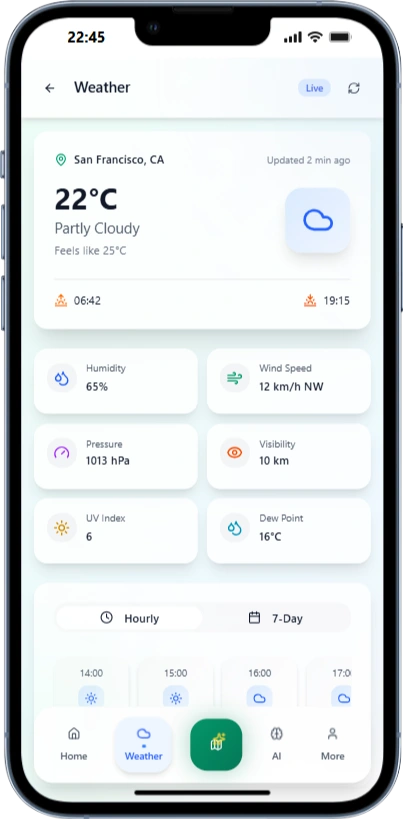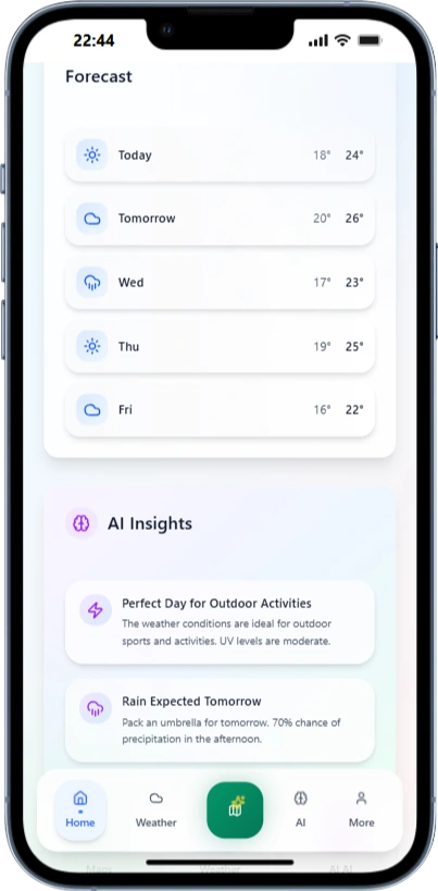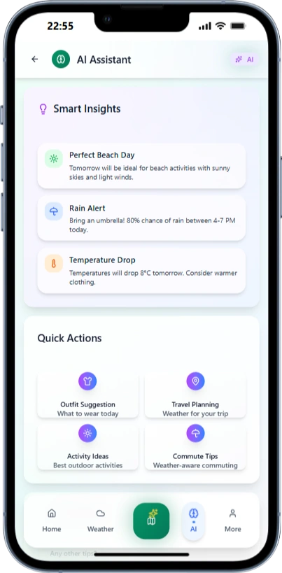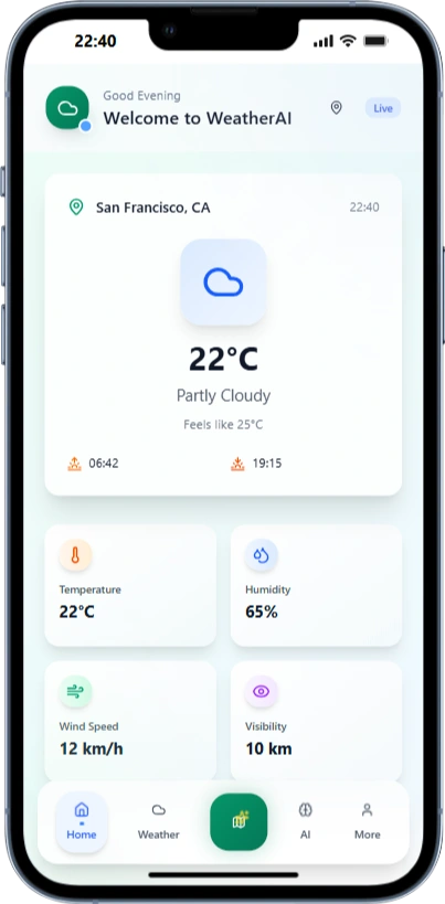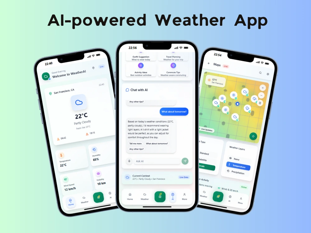 I built an AI‑powered weather app that delivers accurate forecasts, live radar maps, and real‑time alerts. It uses AI to synthesize multiple data sources into detailed predictions (temperature, precipitation, wind, air quality, and storm risk). A built‑in AI Chat assistant answers natural‑language questions like “Will it rain after 5 PM?” or “What’s the weekend outlook?” The app supports location‑based tracking, severe weather push notifications, and a clean, responsive design for iOS and Android.