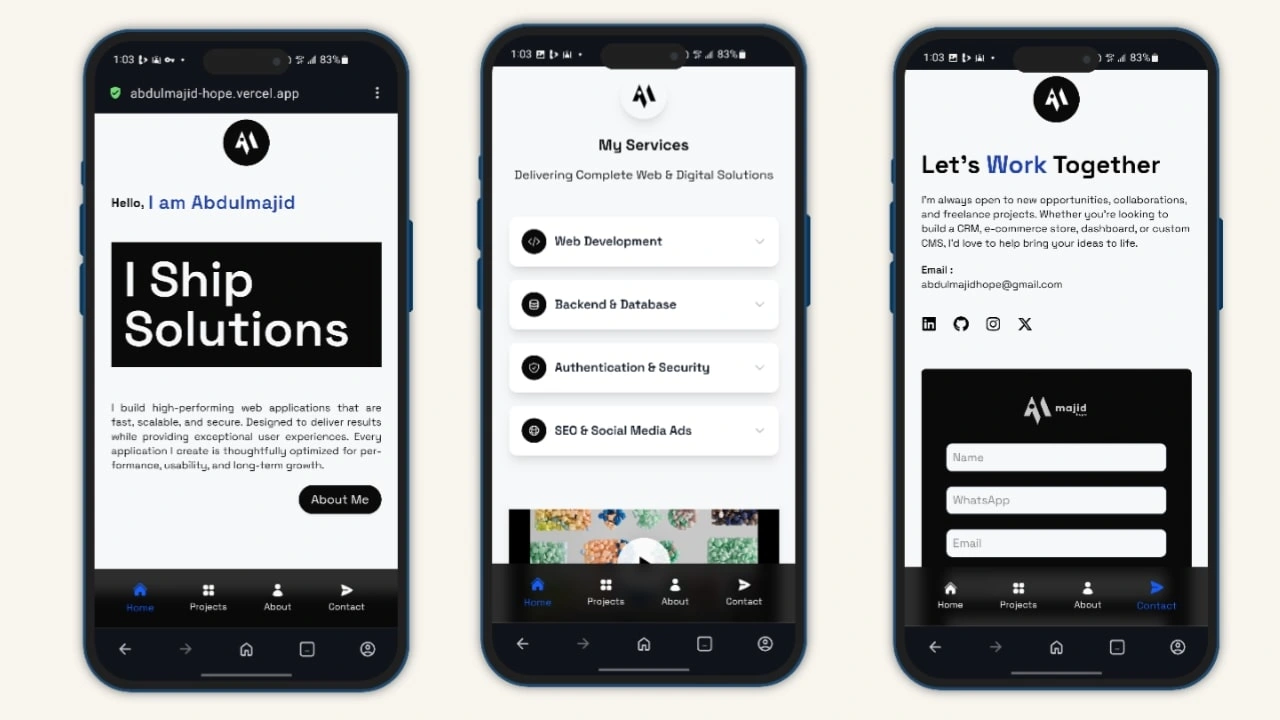 My Personal Portfolio Website was designed to serve as a digital home for my work, a place where creativity meets clarity. Built with a focus on clean and smooth user interaction, it showcases my projects, technical skills, and professional journey in a way that’s both engaging and easy to navigate.