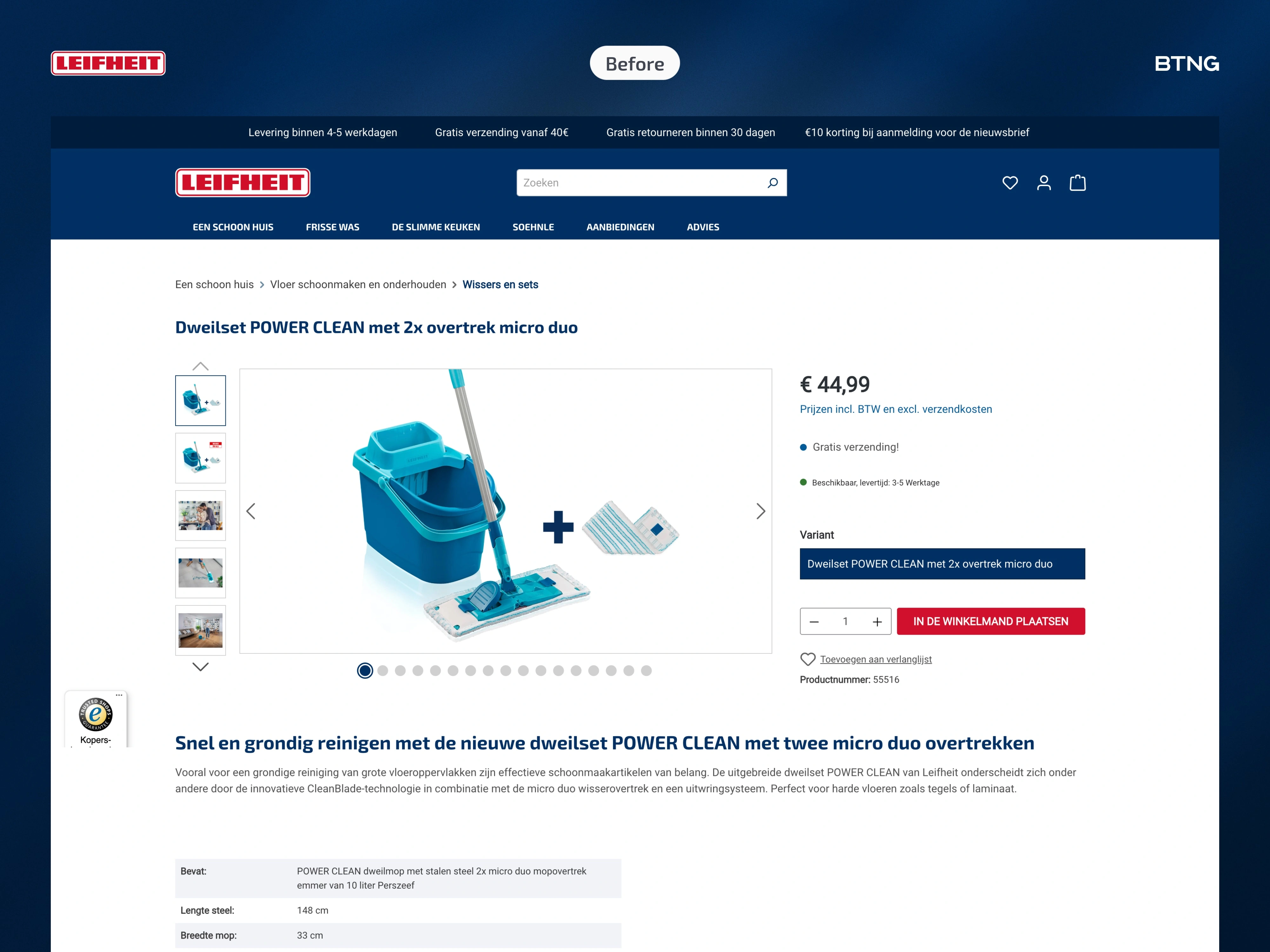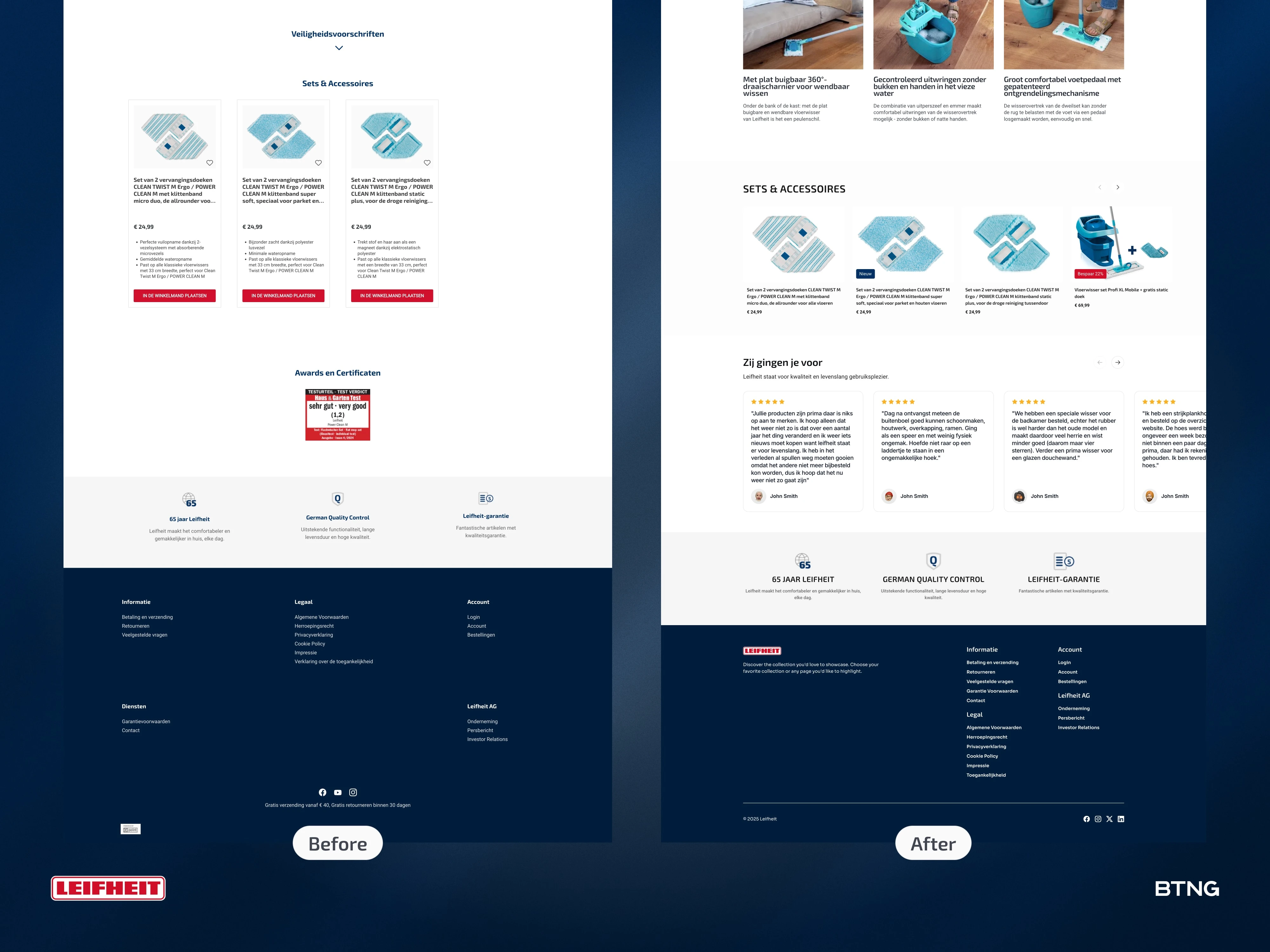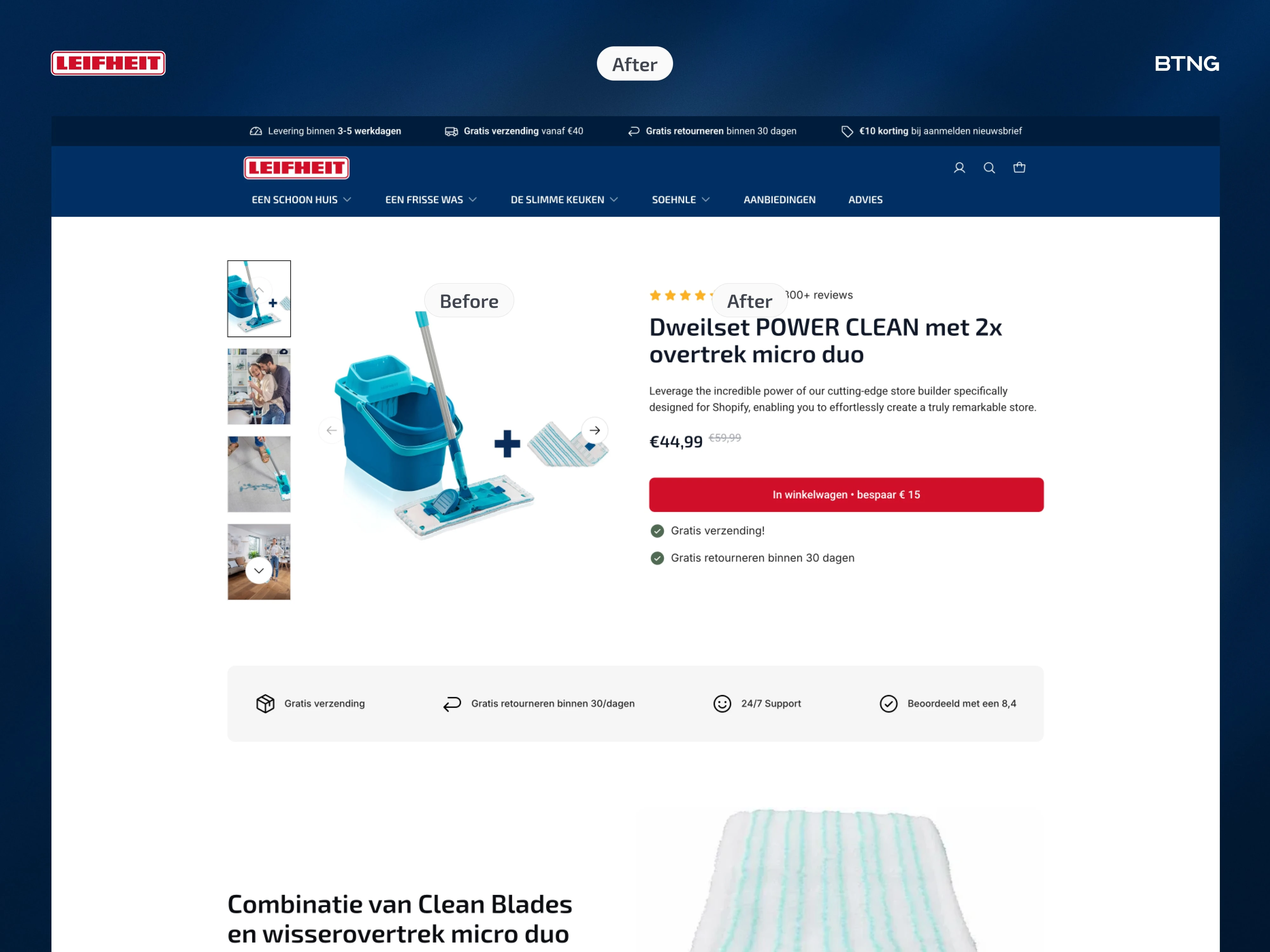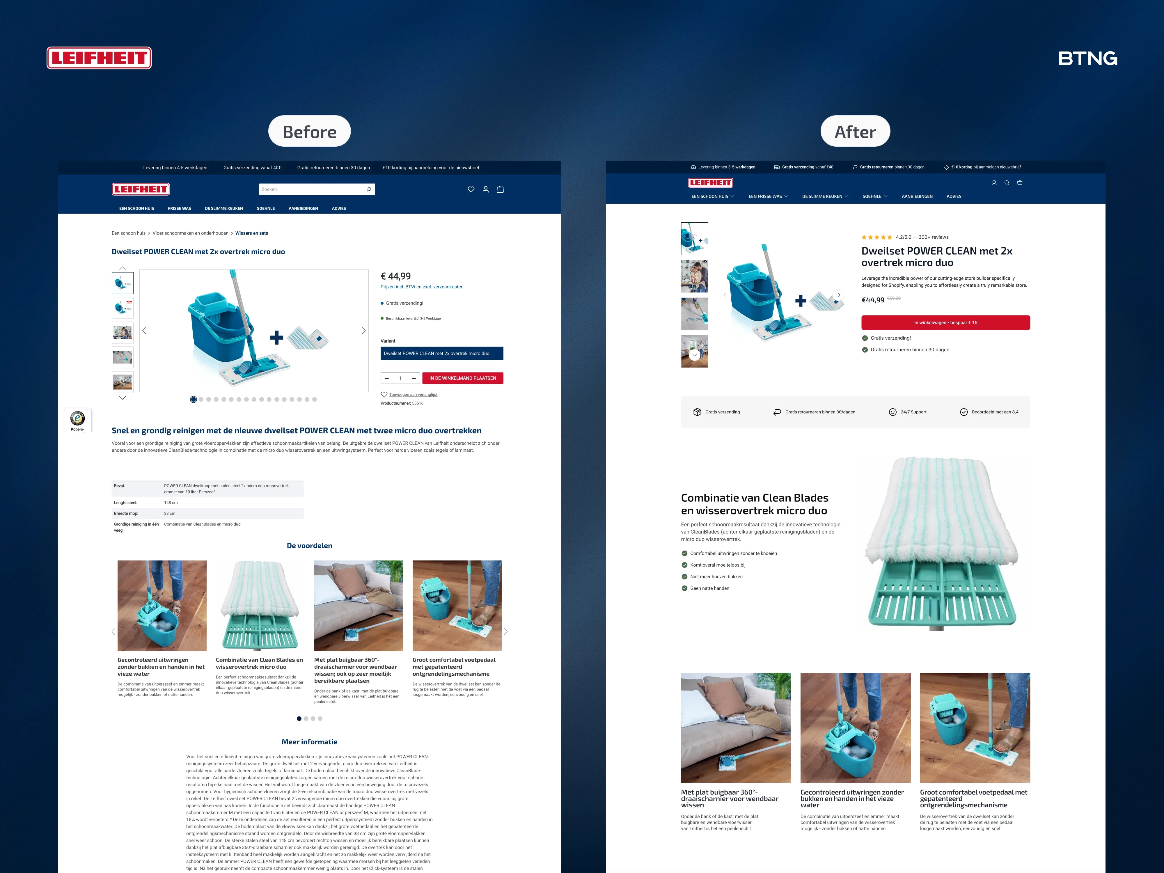 I grouped all the critical info on the right side. Title, subtitle, reviews, price, add to cart, USPs. Everything a buyer needs to decide sits in one clear block.