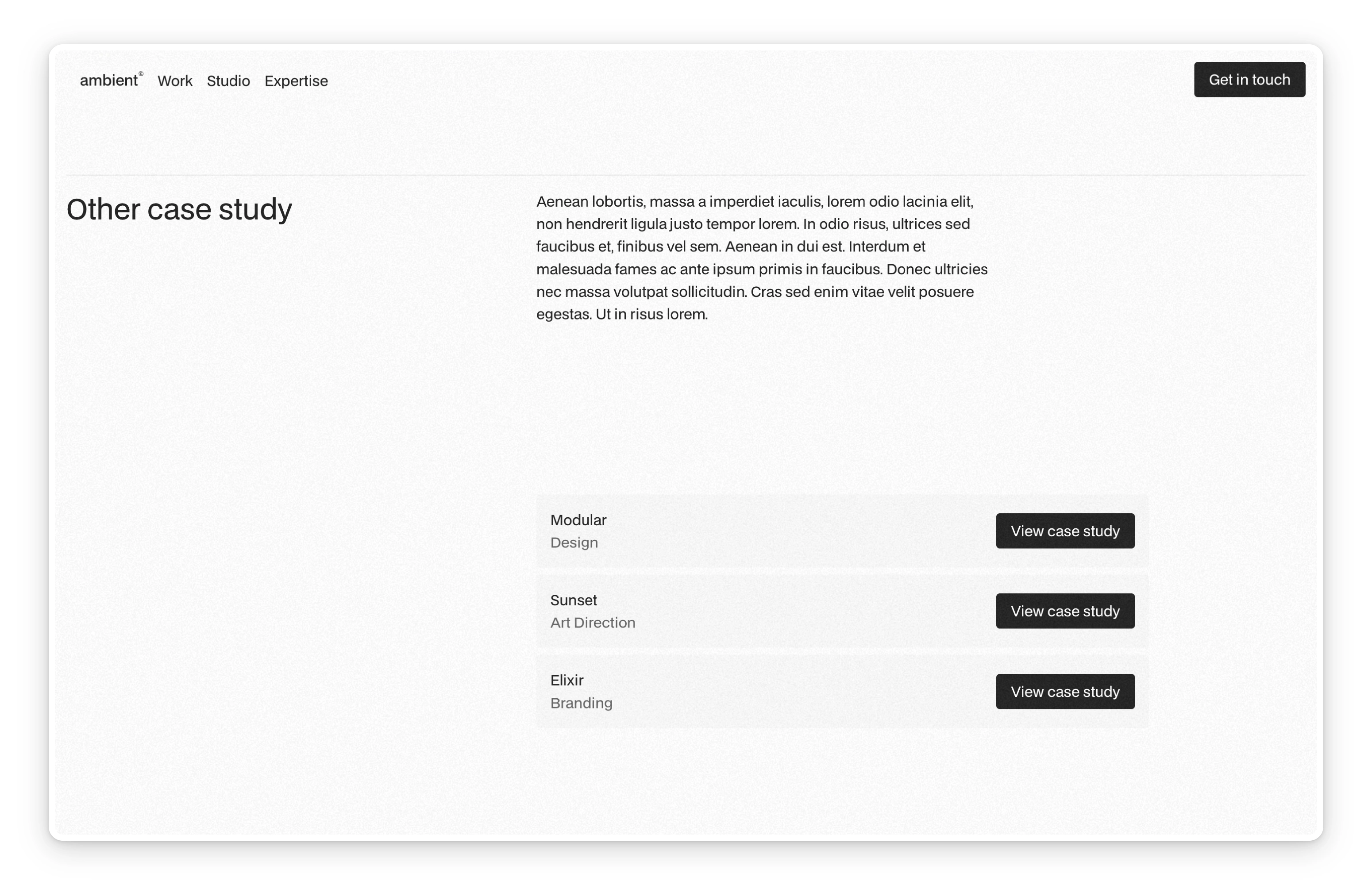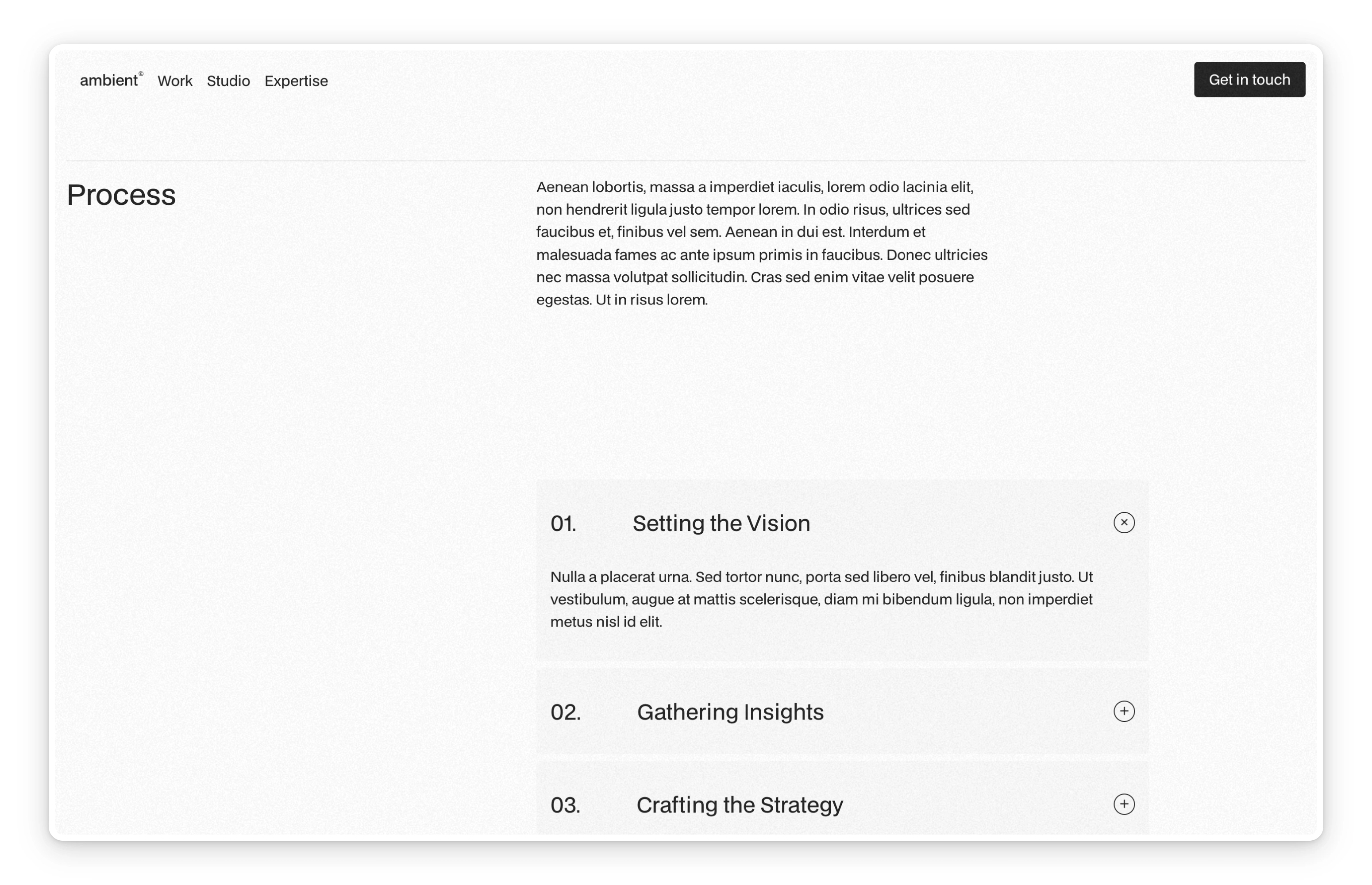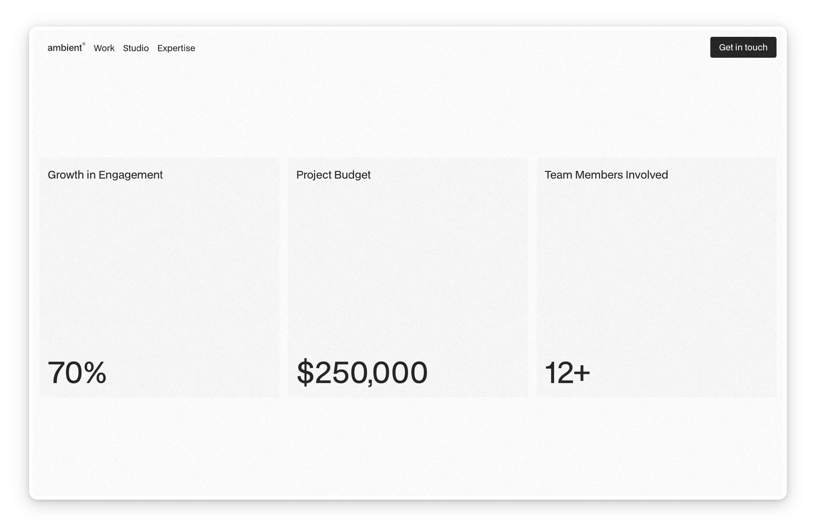 Ambient is a modern Webflow project with a clean, minimalist design system, built for agencies and consultants to showcase services with clarity and style.