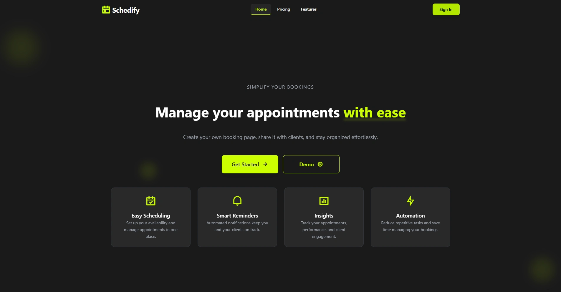 Schedify is a sleek, responsive web application that streamlines appointment scheduling for businesses and clients. The platform features a clean, modern interface, real-time booking management, and seamless calendar integration. This project highlights my skills in creating user-friendly web apps that combine functionality with polished design, ensuring a smooth experience across desktop and mobile devices.